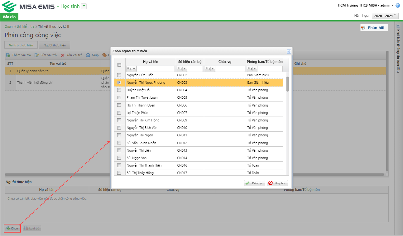 - Mỗi cán bộ, giáo viên chỉ được chọn thực hiện 1 công việc nào đó 1 lần, từ lần thêm sau sẽ không hiển thị cán bộ, giáo viên đó trên danh sách chọn người thực hiện cho công việc đó.