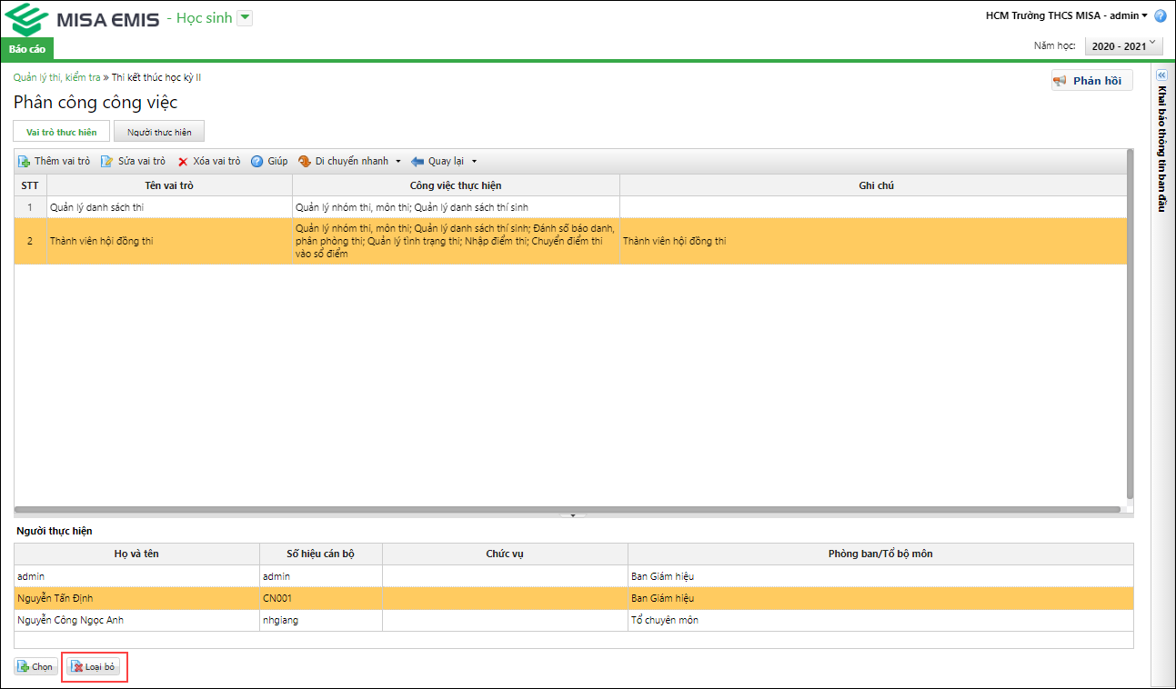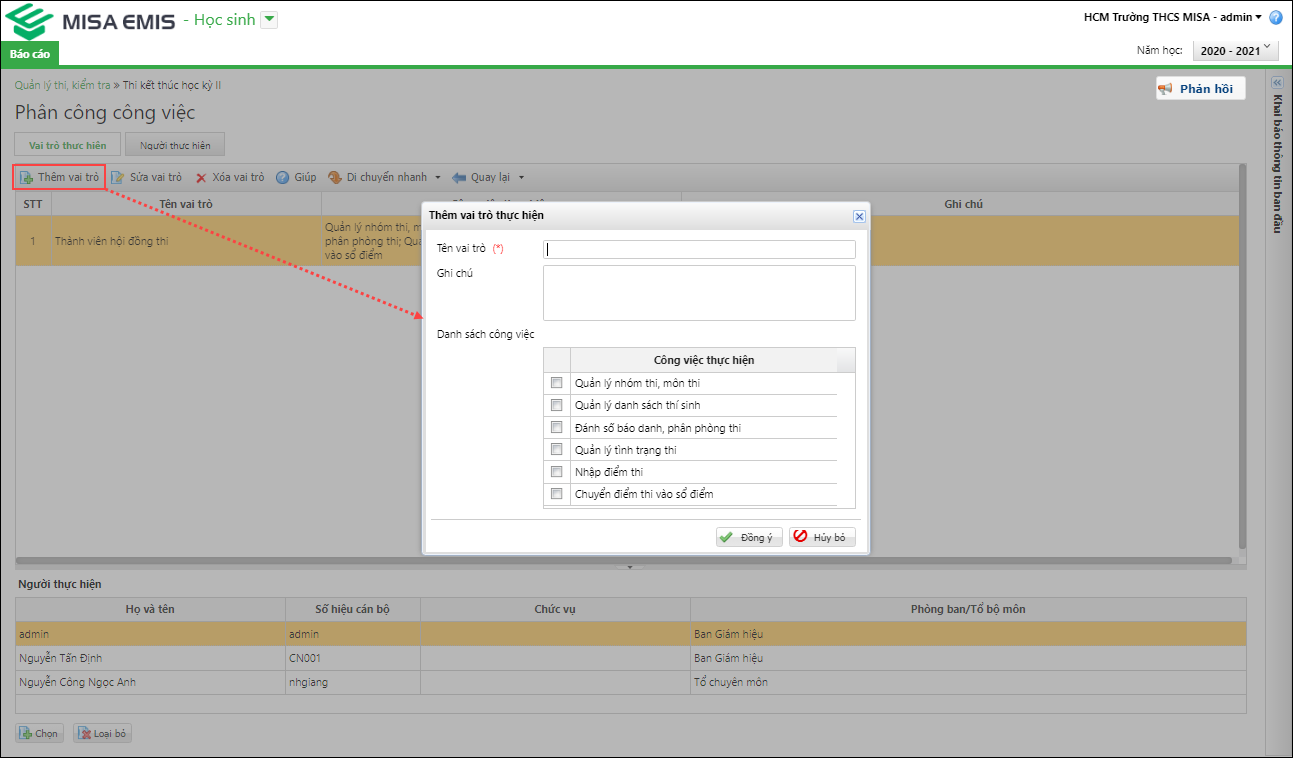 - Chỉ có Hiệu trưởng, người Quản trị hệ thống và người tạo kỳ thi mới được thực hiện phân công công việc cho những thành viên còn lại.