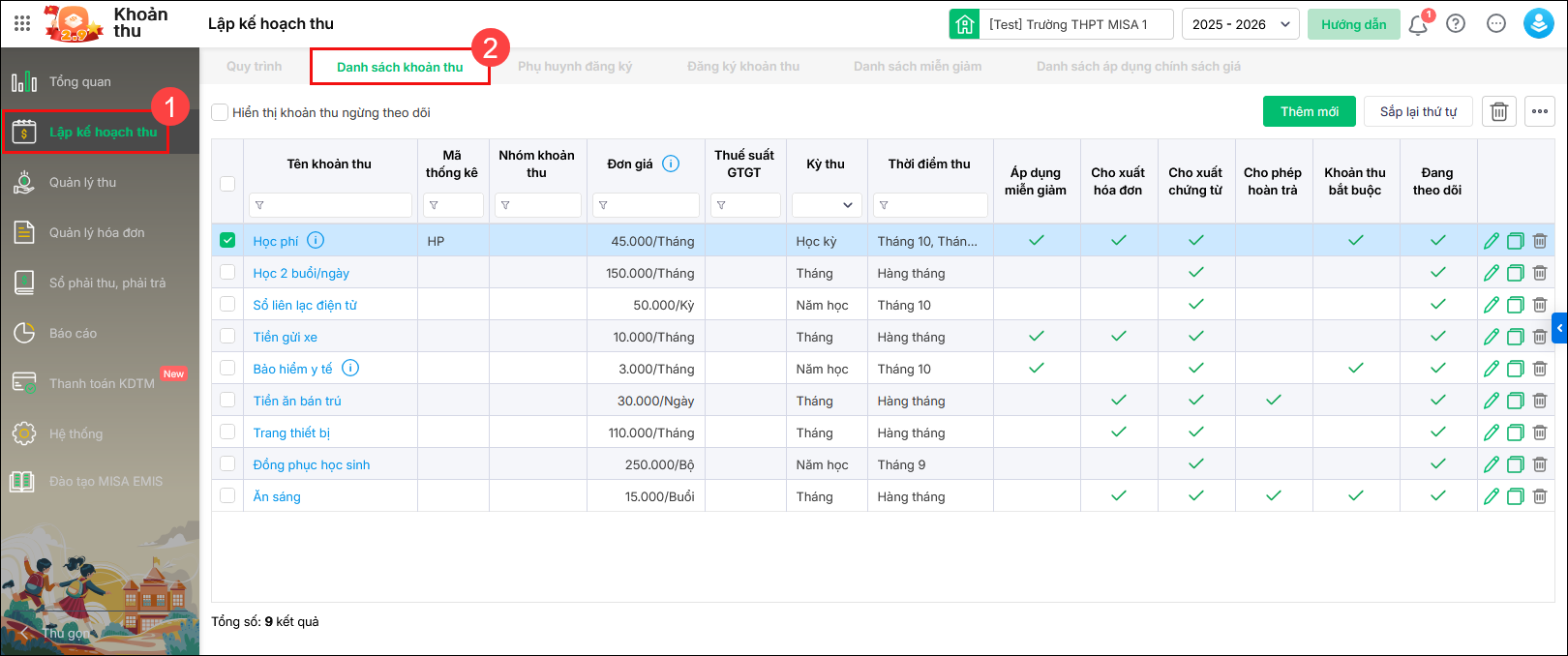 1. Vào Lập kế hoạch thu\Danh sách khoản thu