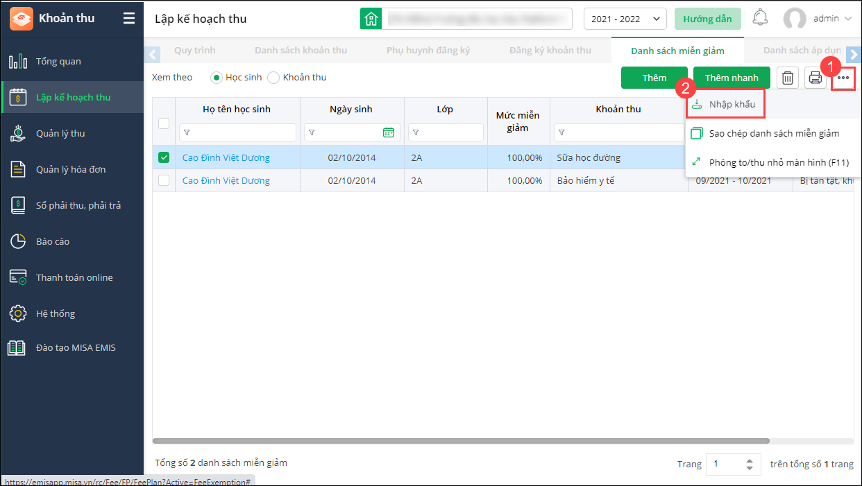 Trường hợp nhà trường có nhiều học sinh được miễn giảm, anh/chị thực hiện Thêm nhanh danh sách miễn giảm hoặc Nhập khẩu danh sách miễn giảm.