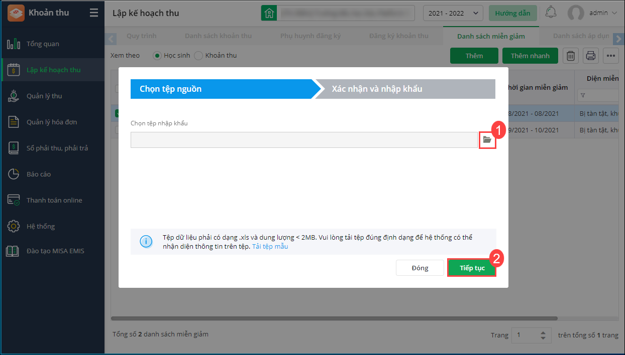 Bước 2: Nhấn vào biểu tượng để tải lên tệp danh sách học sinh miễn giảm, chọn Tiếp tục.