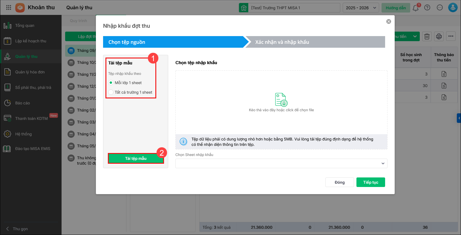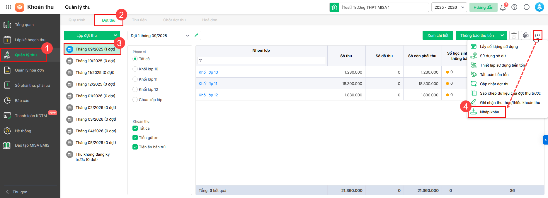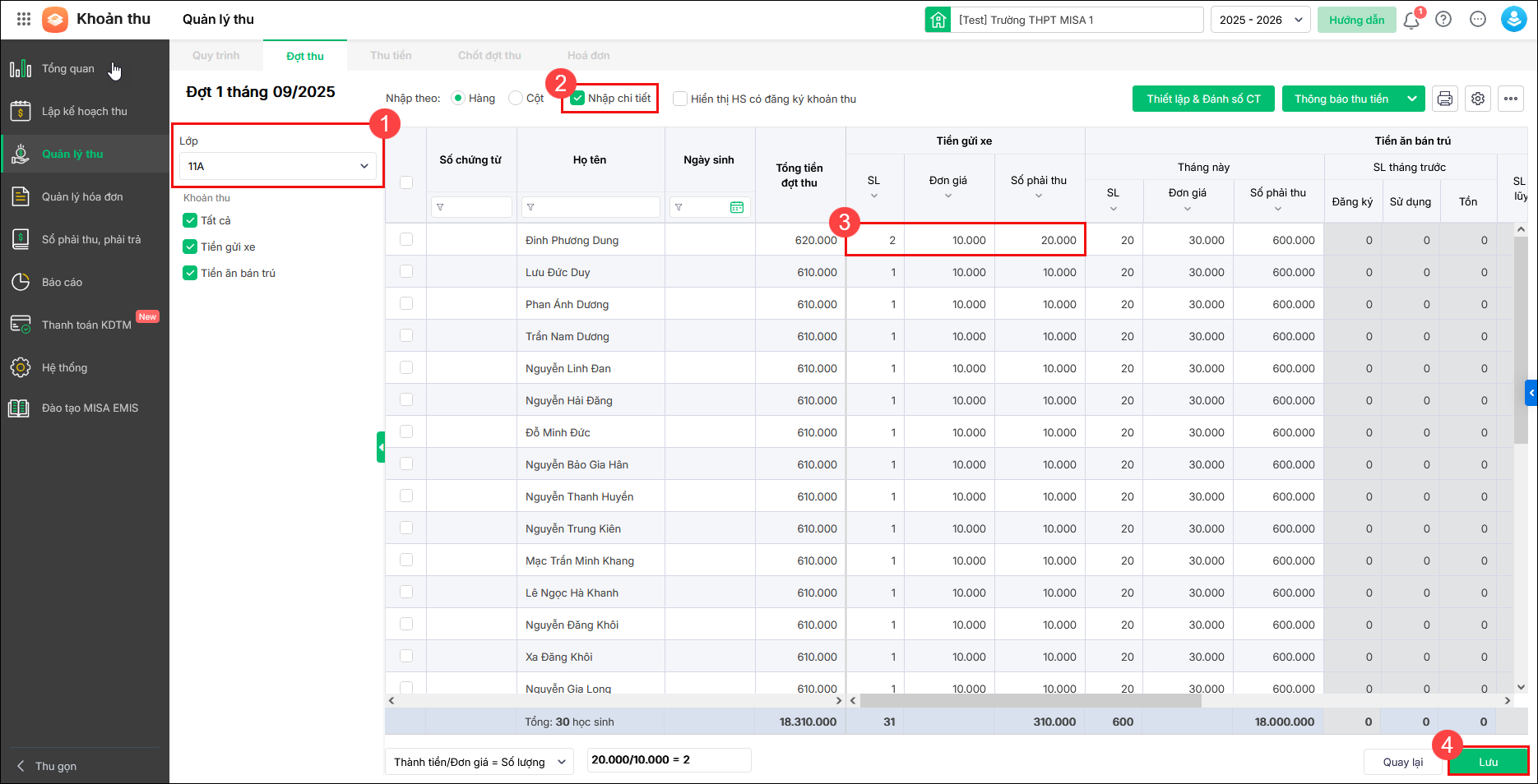 Ví dụ: Đầu tháng, học sinh A đăng ký khoản thu Tiền ăn bán trú số lượng là 20 buổi, nhưng đến cuối tháng học sinh A nghỉ học 5 buổi. Phụ huynh muốn nộp tiền theo đúng số buổi học sinh đi học. Lúc này kế toán thực hiện thay đổi số lượng theo thực tế của học sinh.