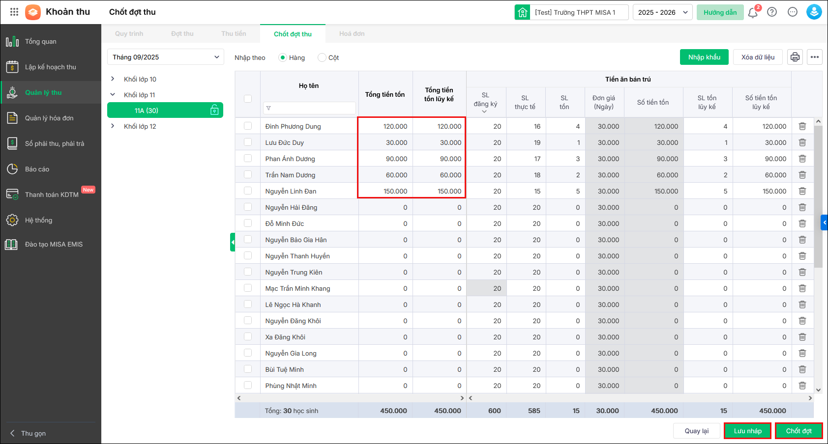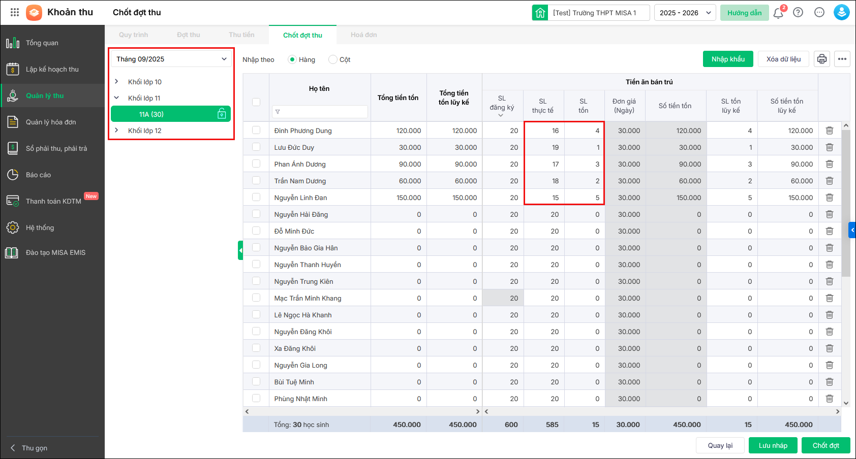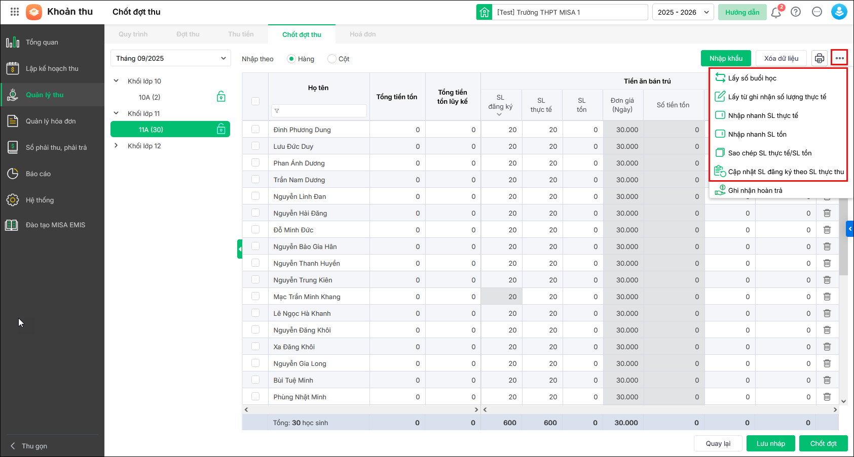 Để chốt số buổi ăn/hoàn trả cho học sinh, bạn thực hiện theo các cách sau đây: