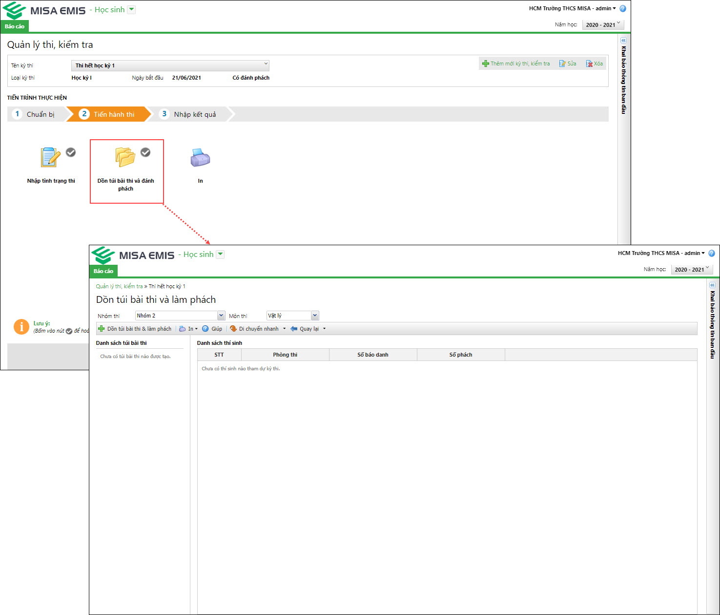 - Nếu 1 môn thi chưa được dồn túi bài thi và đánh phách thì chưa thể xác nhận hoàn thành công việc “Dồn túi bài thi và đánh phách”