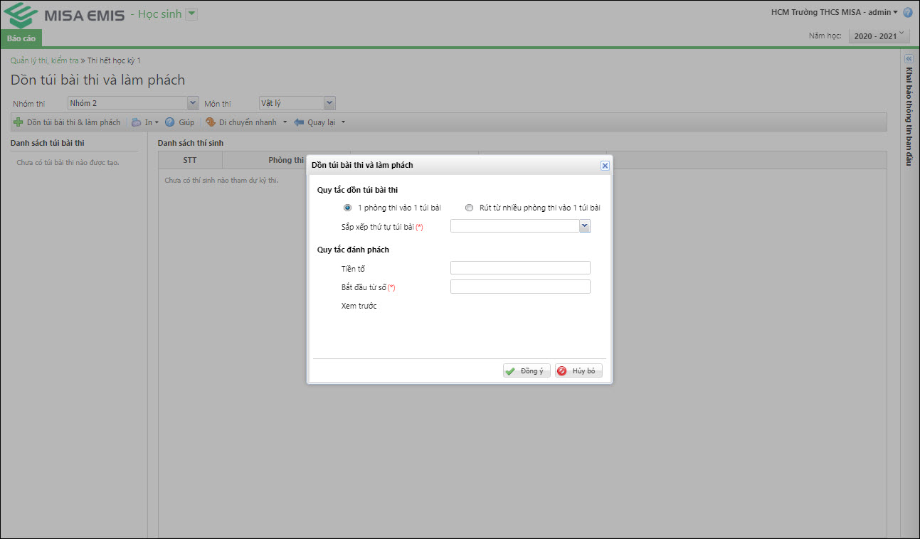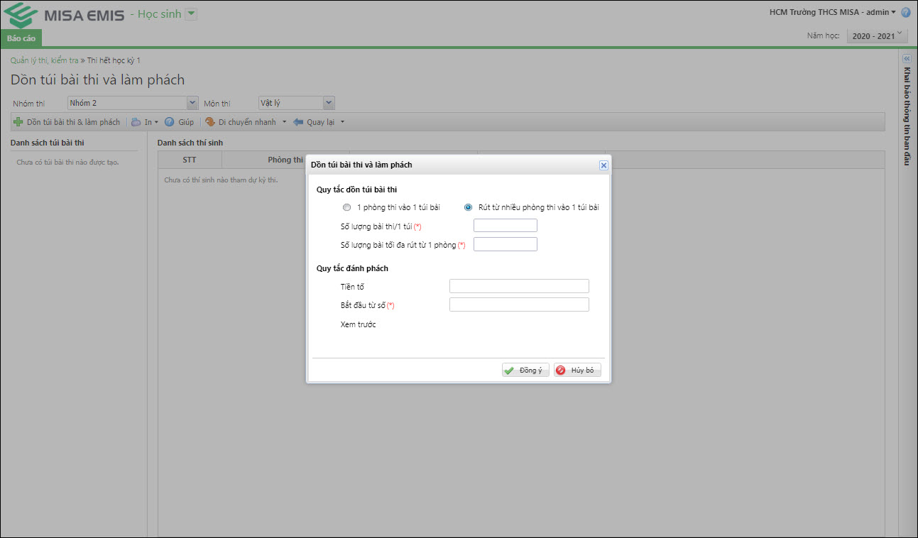Chức năng này hỗ trợ Hội đồng thi chia bài thi vào các túi và gán số phách cho các bài thi này (đối với kỳ thi có đánh phách) theo quy tắc đặt ra.