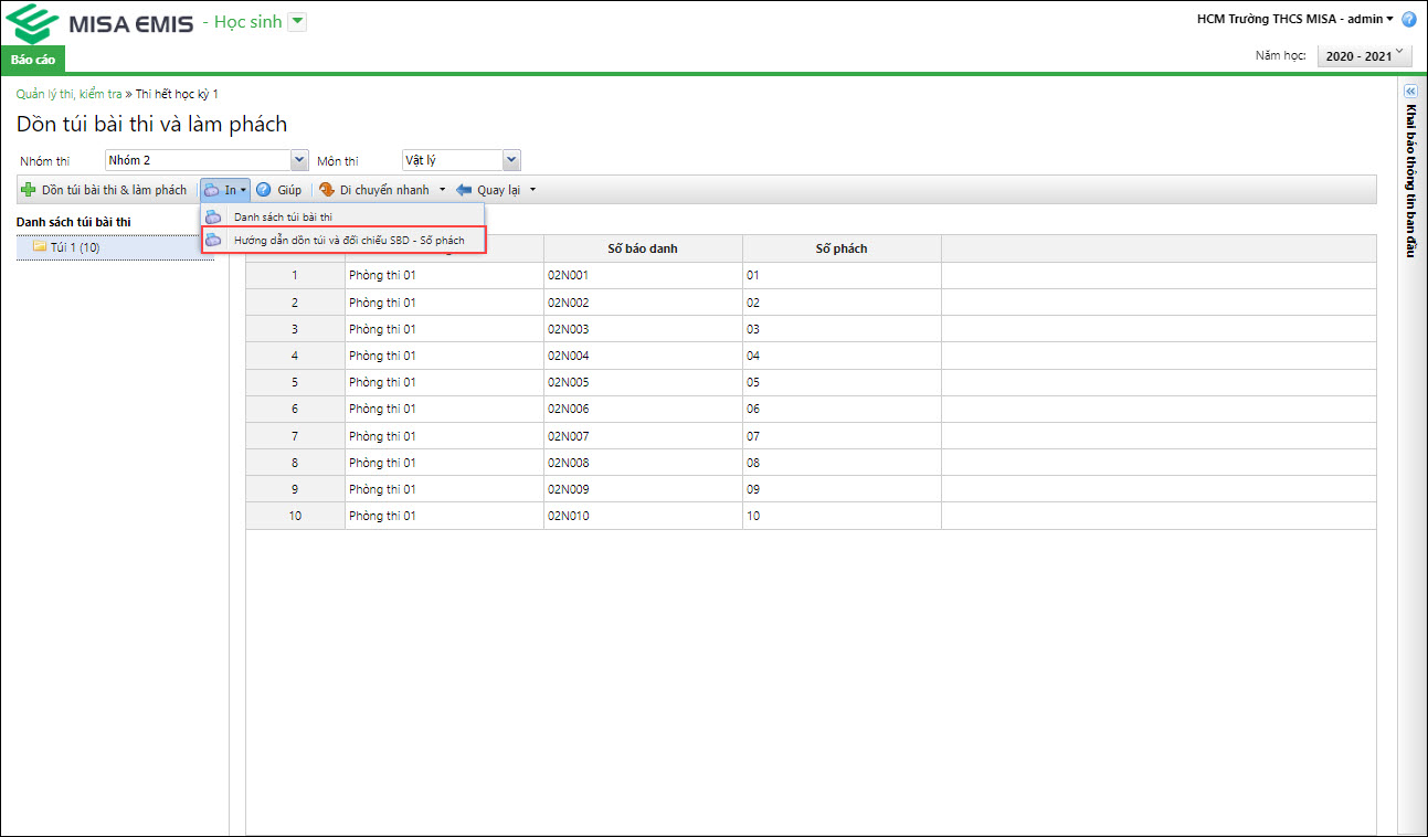 - In Hướng dẫn dồn túi và đối chiếu SBD – Số phách tại màn hình kết quả dồn túi bài thi và làm phách