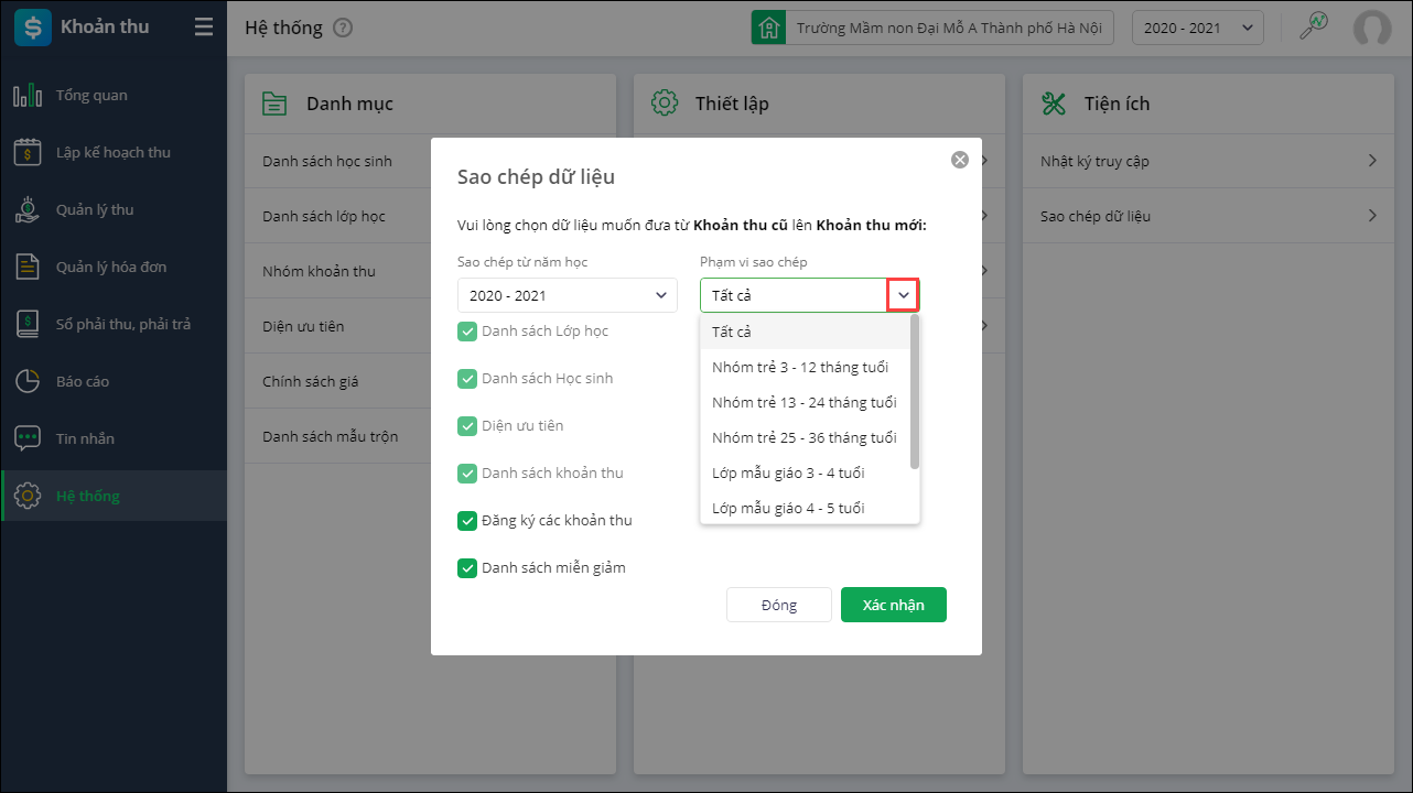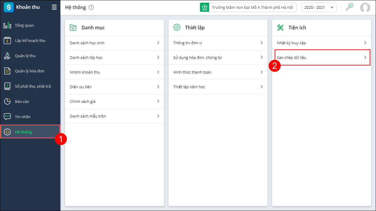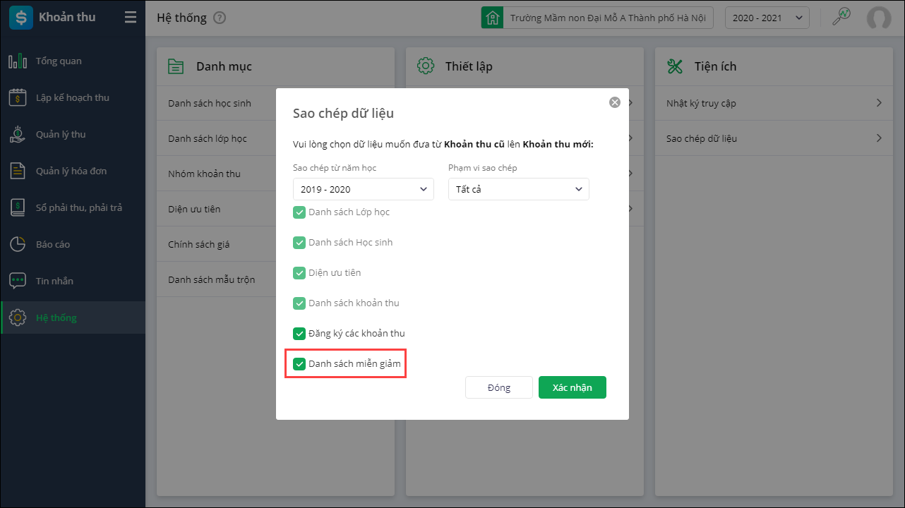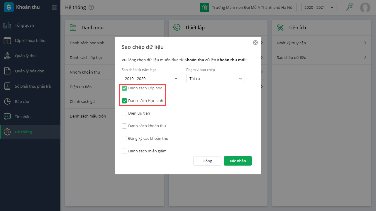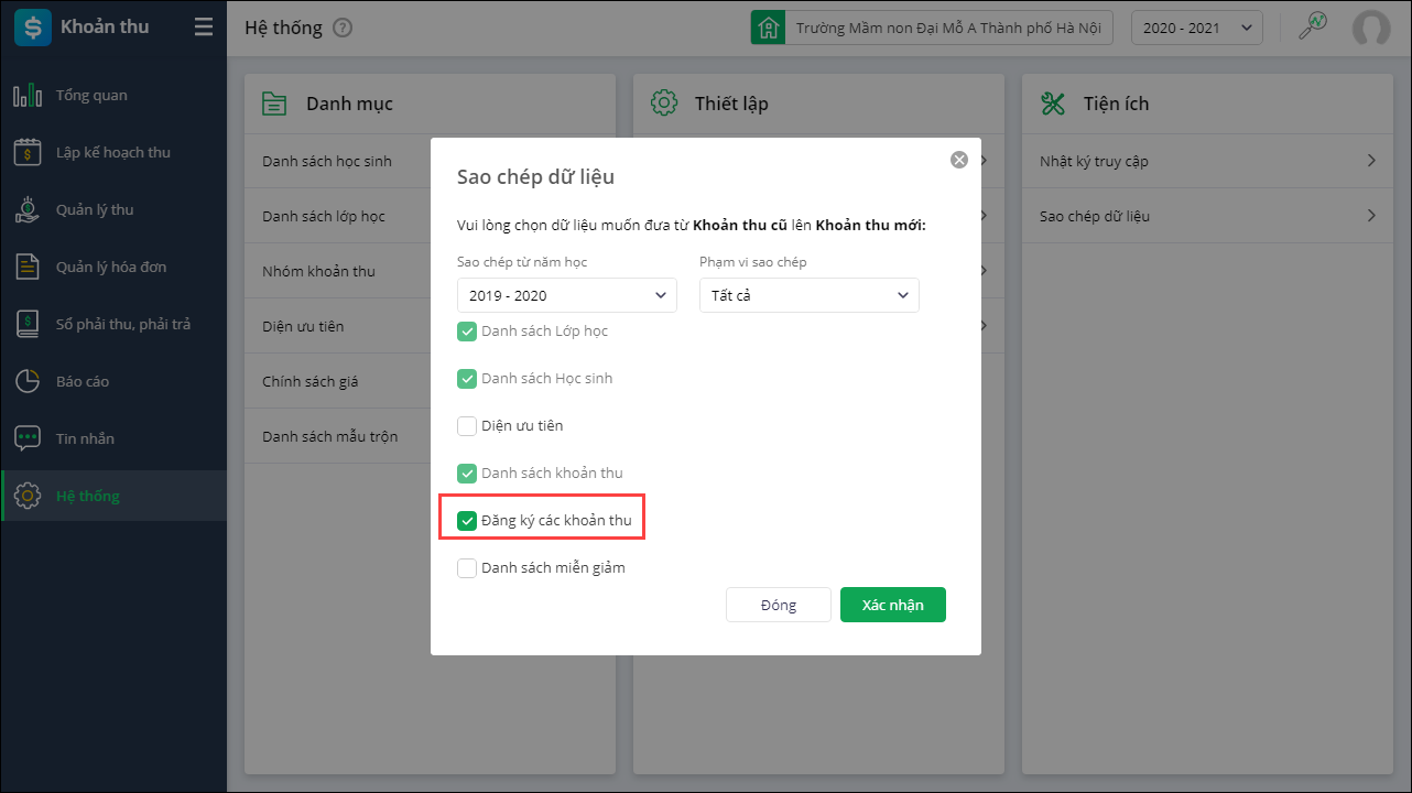 Lưu ý: Trường hợp bỏ qua thông báo, vào Hệ thống\Tiện ích\Sao chép dữ liệu từ phân hệ khoản thu cũ