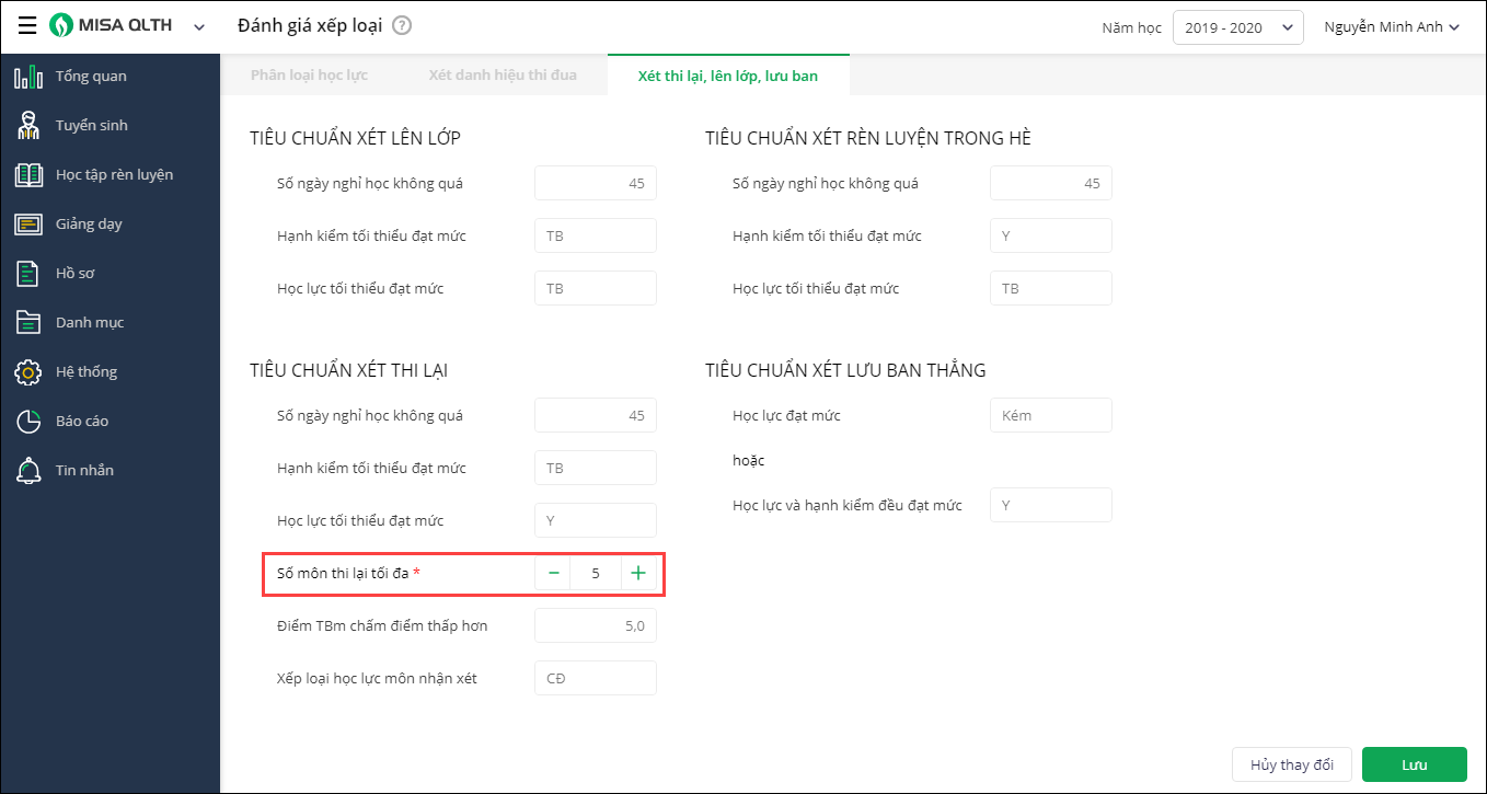 3. Tại màn hình Xét thi lại, lên lớp, lưu ban anh/chị có thể thực hiện chỉnh sửa lại thông tin Số môn thi lại tối đa theo đúng thực tế áp dụng tại đơn vị của mình. Nhấn Lưu.