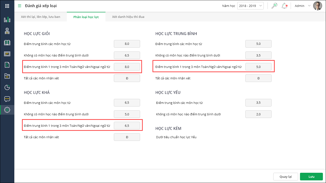 2. Thiết lập bổ sung tiêu chí phân loại Học lực