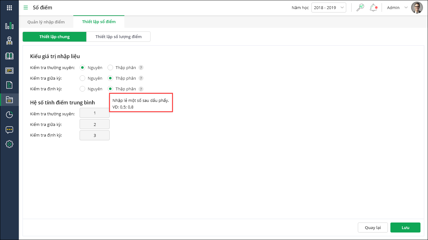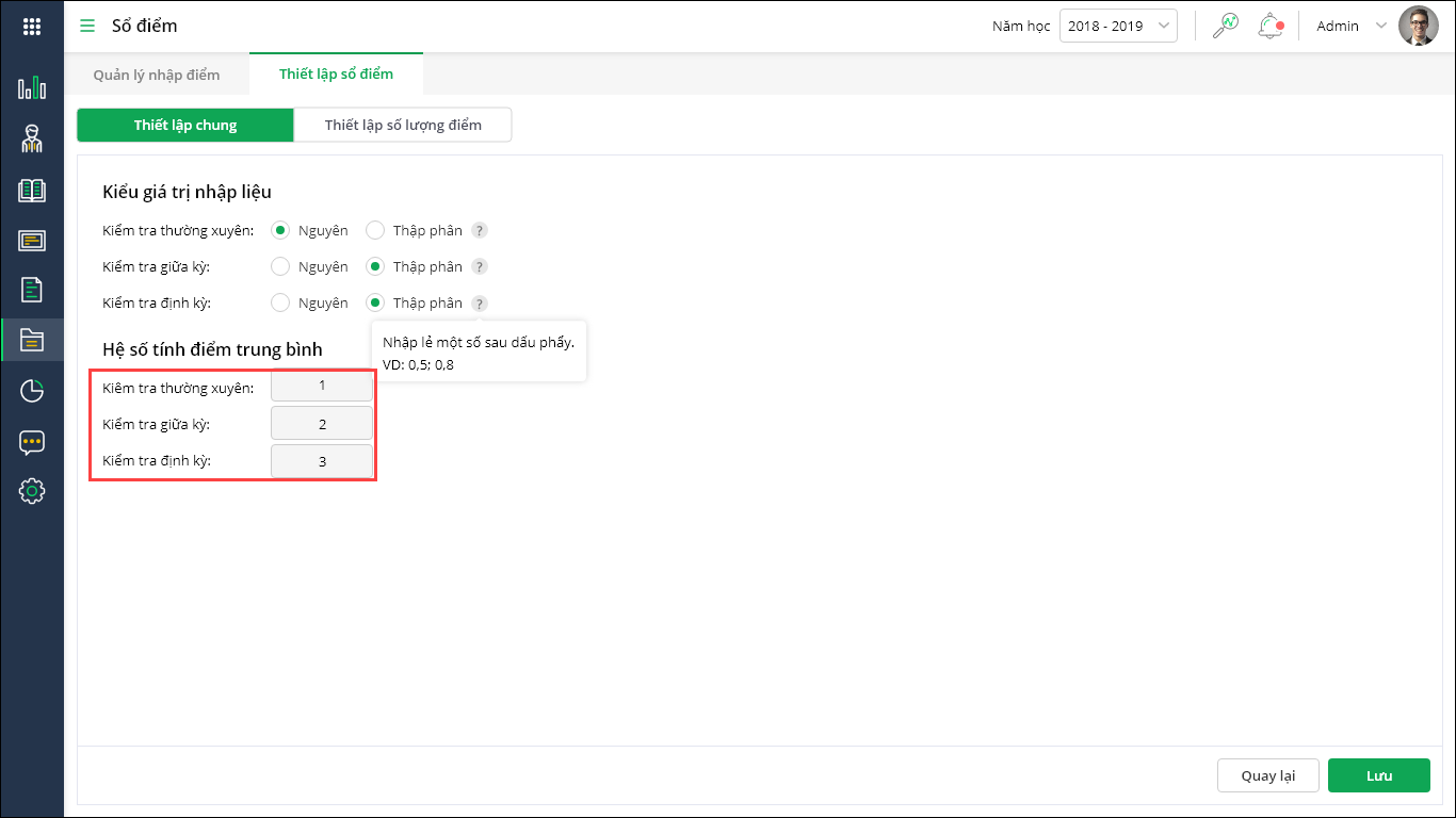 Tích chọn kiểu giá trị điểm của các con điểm là Nguyên hoặc Thập phân (theo nhu cầu của thực tế đơn vị)