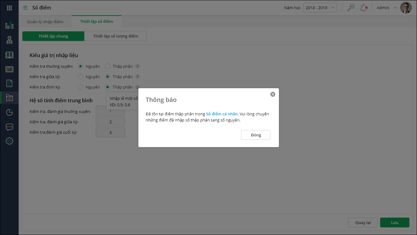 Lưu ý: Khi thực hiện thiết lập định dạng điểm, trường hợp đã có điểm thập phân trong Sổ điểm cá nhân, anh/chị thực hiện những điểm sổ thập phân sang số nguyên.