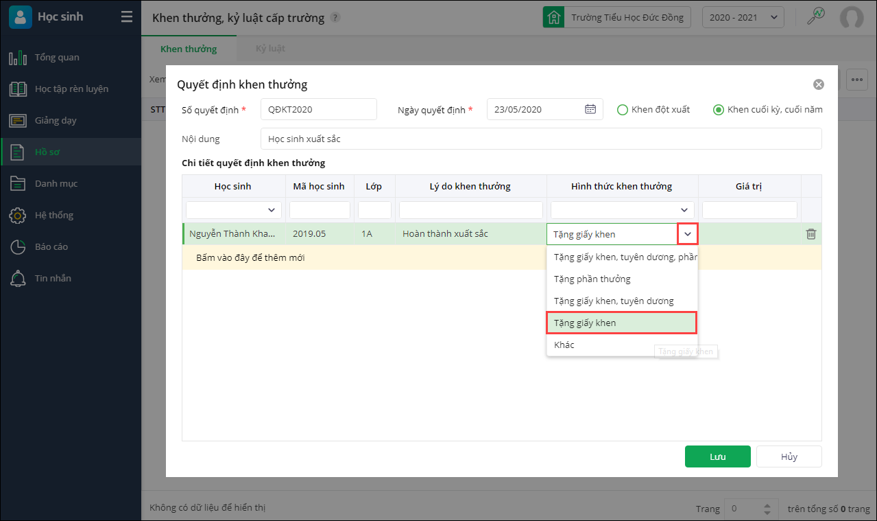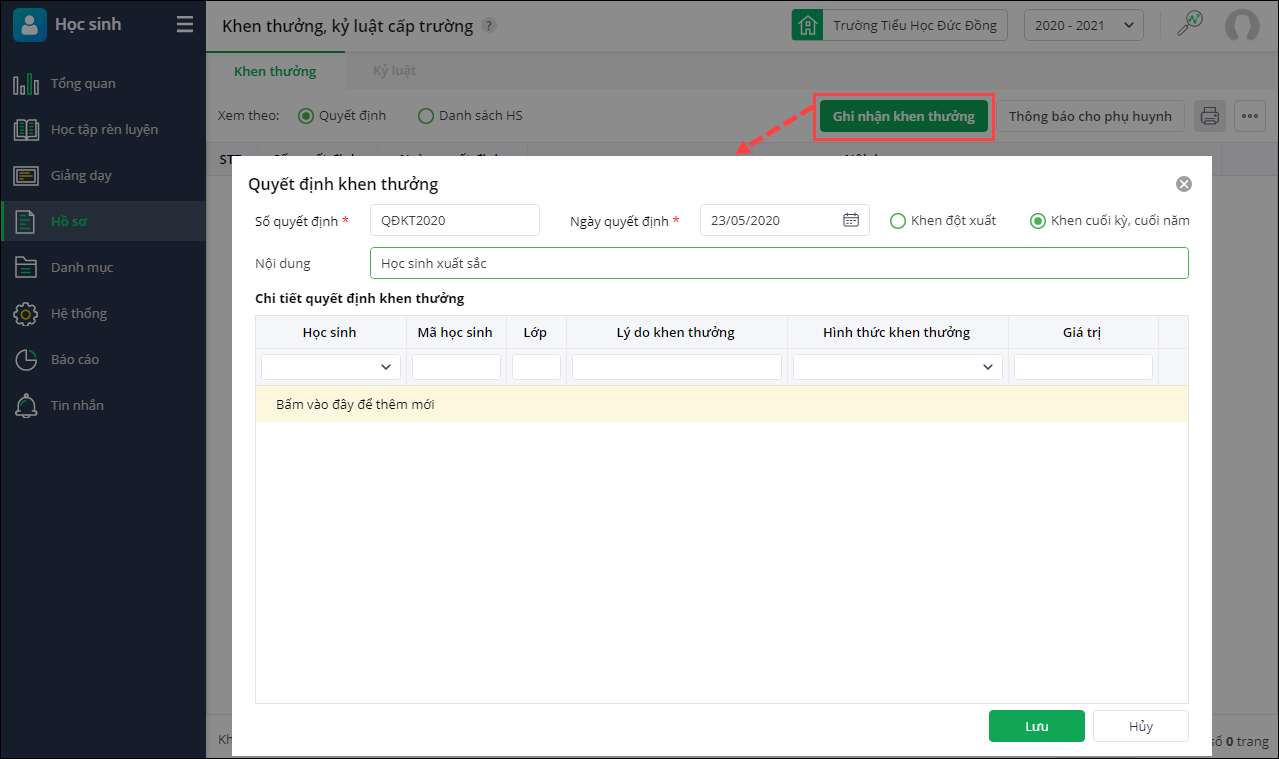 - Khai báo lần lượt chi tiết nội dung khen thưởng của học sinh theo Họ và tên, Lý do khen thưởng, Hình thức khen thưởng, Giá trị khen thưởng