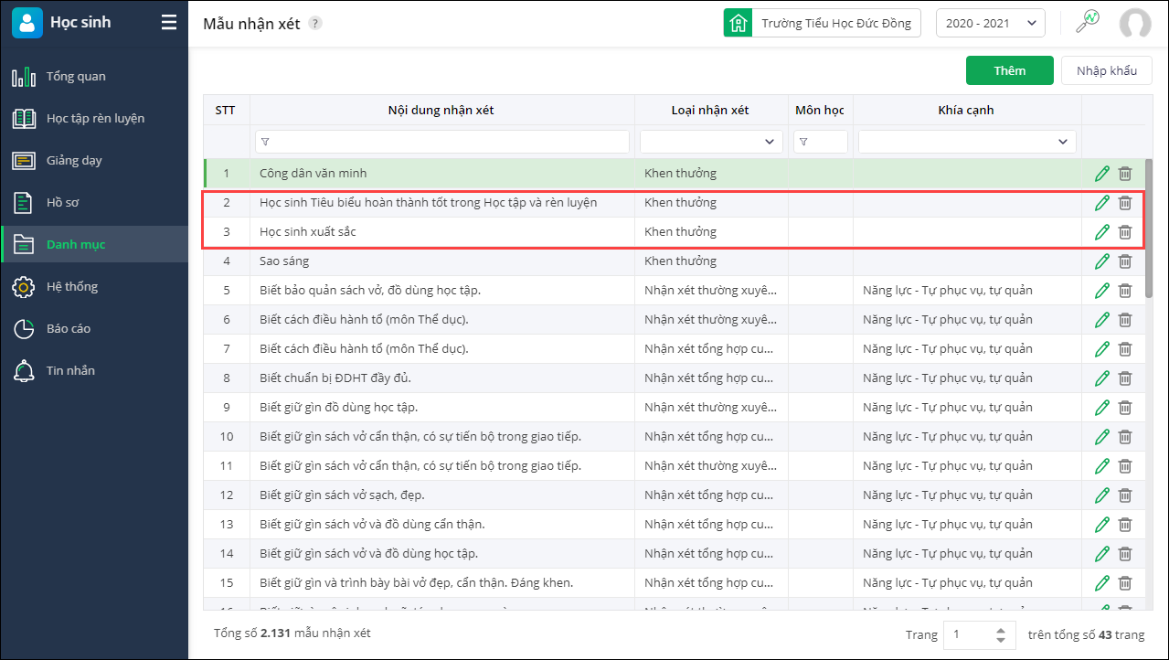 - Vào Học sinh\Danh mục\Mẫu nhận xét