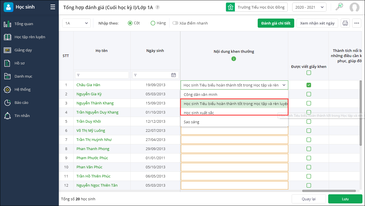 - Bổ sung loại nhận xét khen thưởng Học sinh xuất sắc và Học sinh tiêu biểu hoàn thành tốt trong học tập và rèn luyện vào