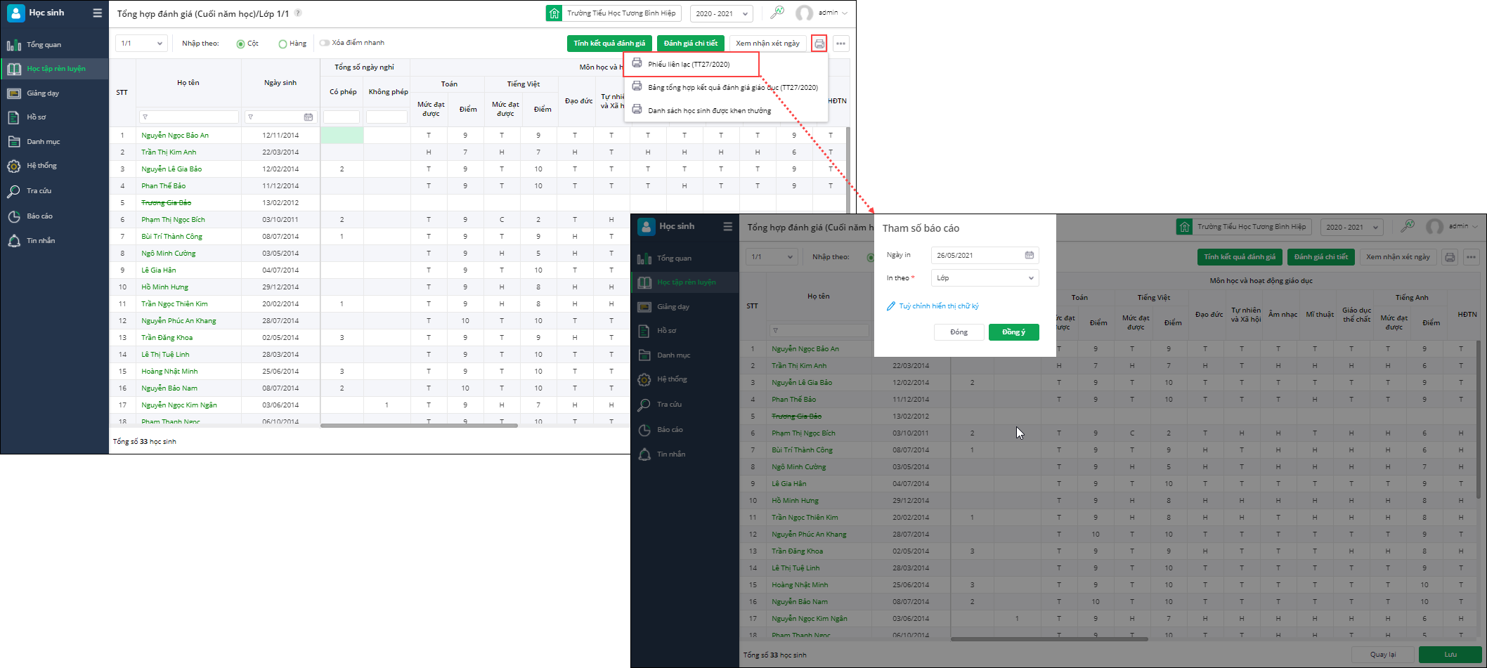 - Chọn biểu tượng máy in\Phiếu liên lạc (TT27.2020)