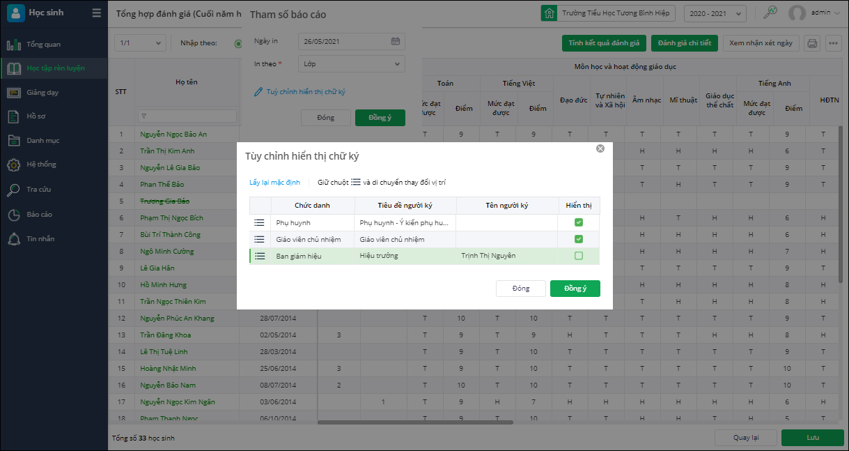 - Tùy chỉnh chân chữ ký phiếu liên lạc phù hợp với đơn vị
