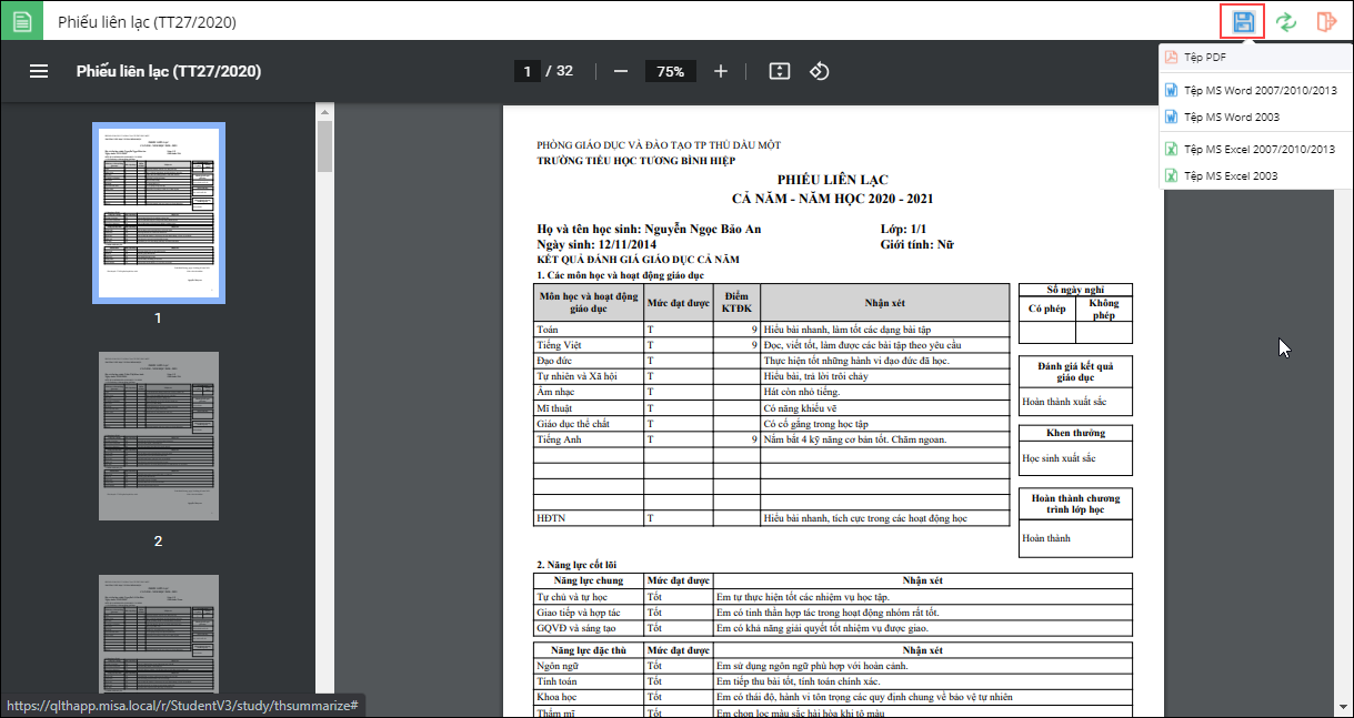 - Nhấn biểu tượng này xuất phiếu liên lạc ra định dạng mong muốn