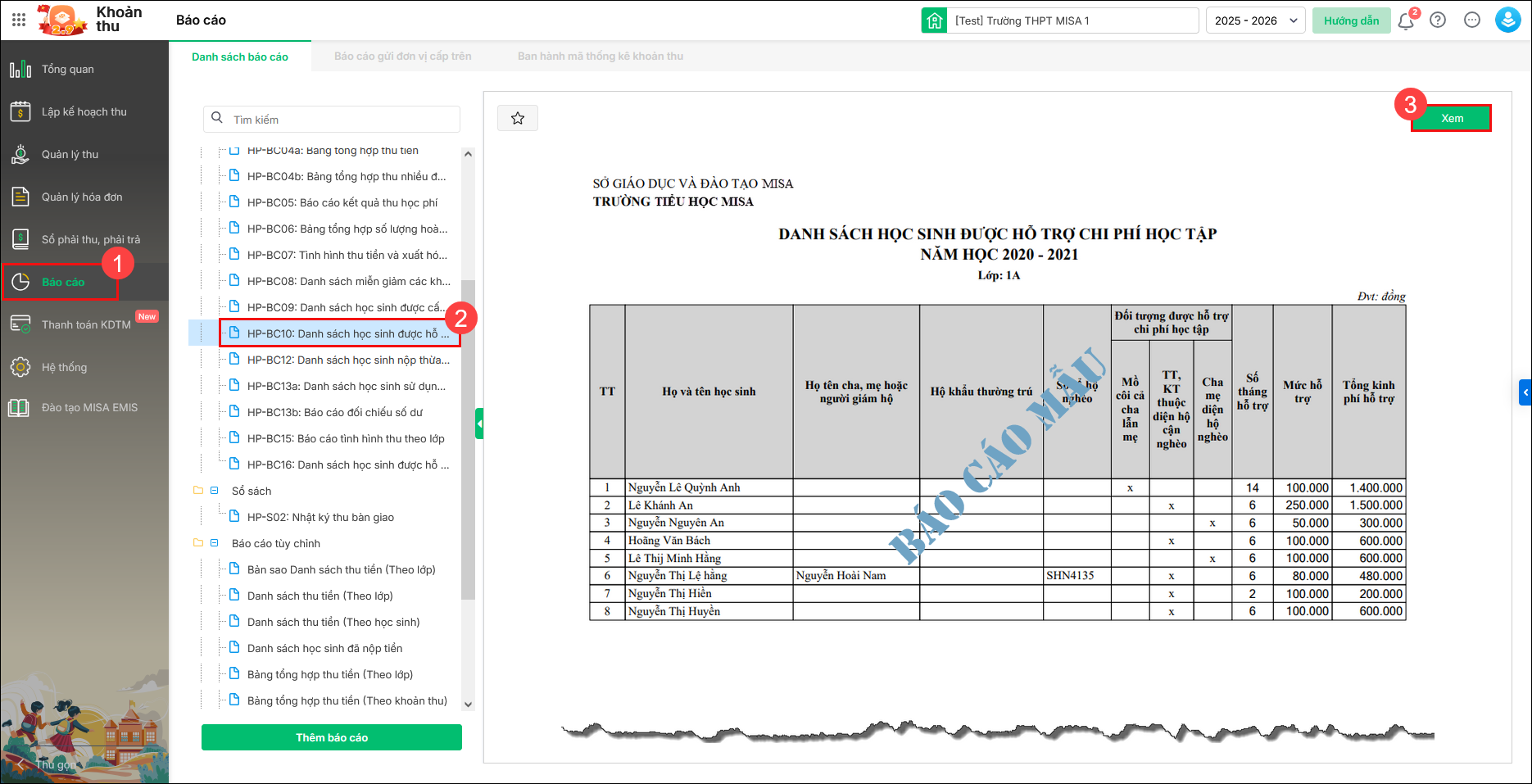 Bước 1: Vào Báo cáo\Danh sách báo cáo. Nhấn đúp chuột vào báo cáo HP-BC10: Danh sách học sinh được hỗ trợ chi phí học tập hoặc nhấn Xem.