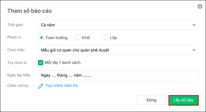 - Ngày lập biểu: Nhập ngày tháng lập biểu cần hiển thị trên báo cáo.