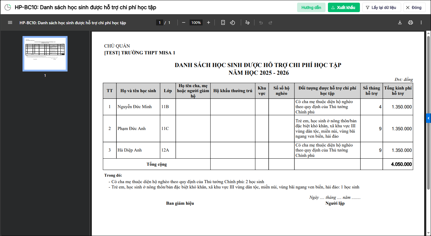 Giúp đơn vị nhà trường có thể nhanh chóng in được danh sách học sinh được hỗ trợ chi phí học tập.