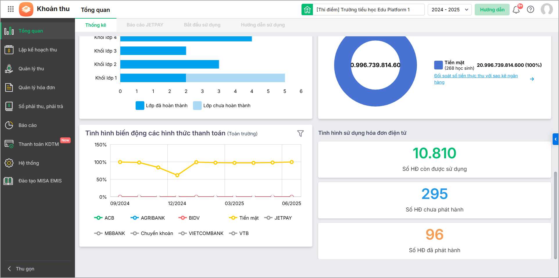 - Tình hình biến động các hình thức thanh toán: theo dõi tình hình thu tiền theo từng hình thức phụ huynh thanh toán (tiền mặt, chuyển khoản,…), từ đó đánh giá hiệu quả thu theo từng hình thức, nắm bắt tình hình triển khai thanh toán không dùng tiền mặt theo Nghị định 123/2020/NĐ-CP của Chính phủ của đơn vị mình.