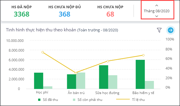 - Tại đây, Hiệu trưởng/kế toán quản lý, theo dõi được tình hình thu tiền của đơn vị mình theo các tiêu chí khác nhau: