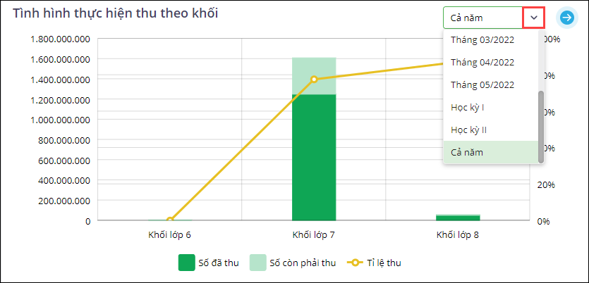 - Tình hình thực hiện thu theo khối: theo dõi tình hình thu tiền học (tổng số phải thu, số đã thu, số còn phải thu) theo từng khối/từng kỳ thu
