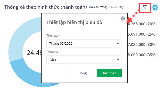 - Thống kê theo hình thức thanh toán: nhanh chóng theo dõi tình hình thu tiền theo từng hình thức phụ huynh thanh toán (tiền mặt, chuyển khoản,…), từ đó đánh giá hiệu quả thu theo từng hình thức, nắm bắt tình hình triển khai thanh toán không dùng tiền mặt theo Nghị định 123/2020/NĐ-CP của Chính phủ của đơn vị mình.