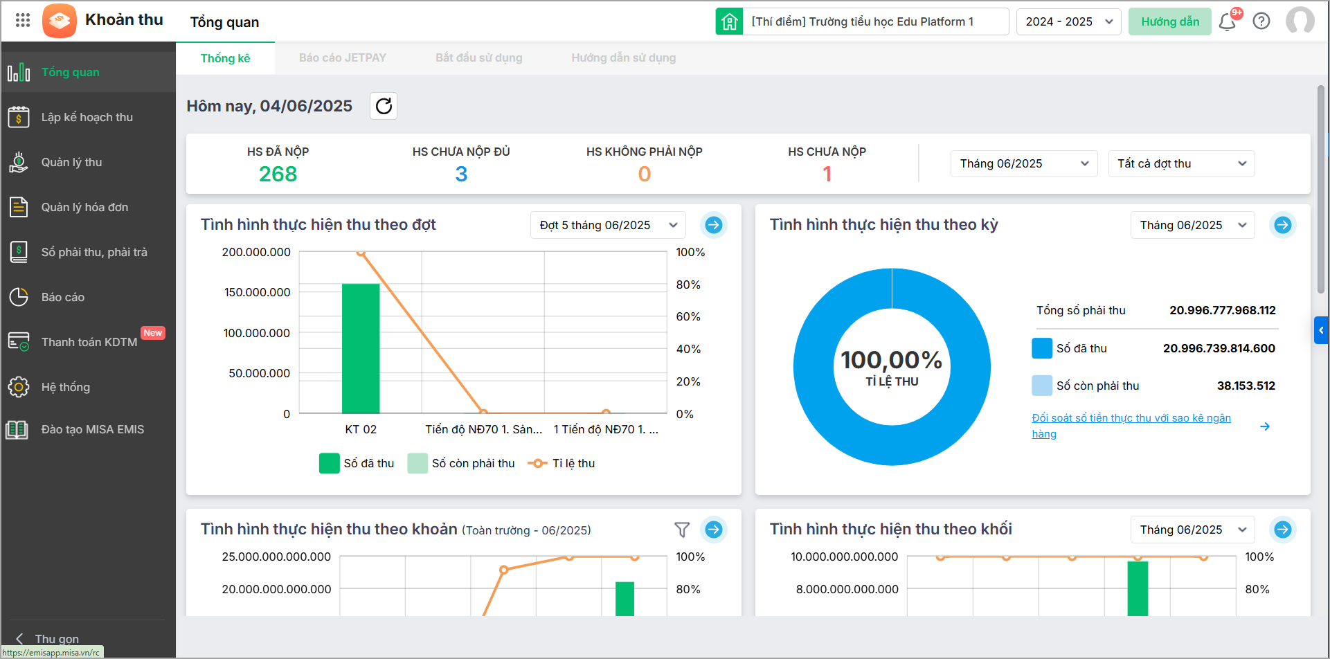 - Tình hình thực hiện thu theo khối: theo dõi tình hình thu tiền học (tổng số phải thu, số đã thu, số còn phải thu) theo từng khối/từng kỳ thu