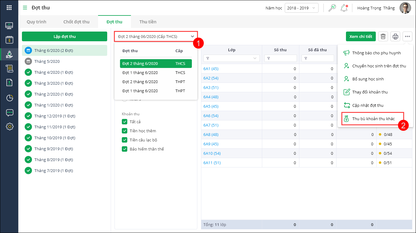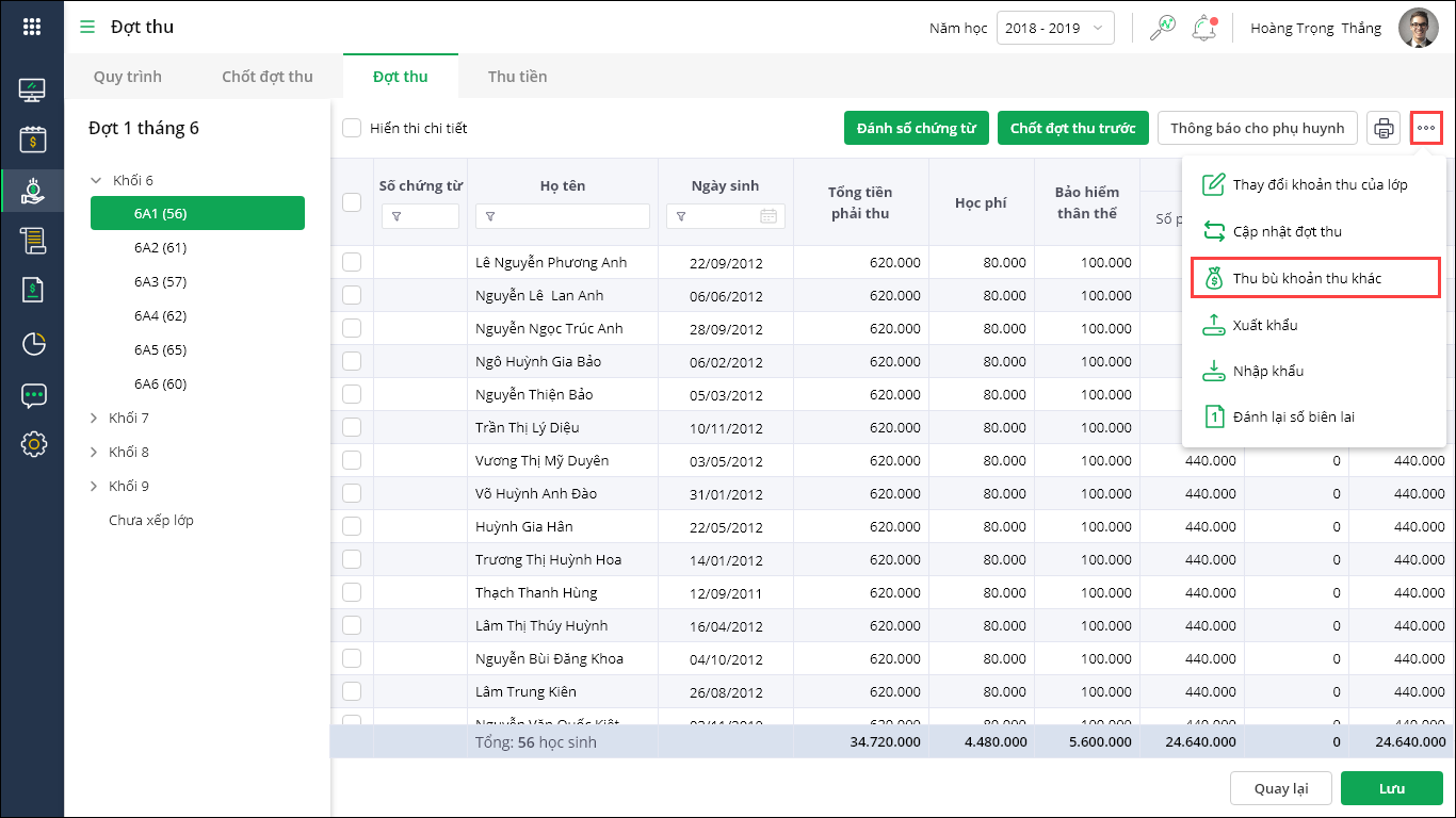 Hoặc tại màn hình danh sách đợt thu, nhấn biểu tượng tiện ích, chọn Thu bù các khoản thu khác
