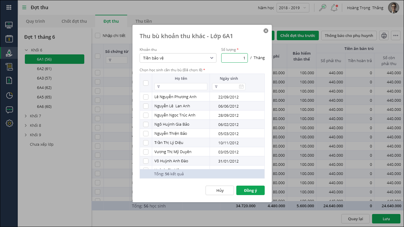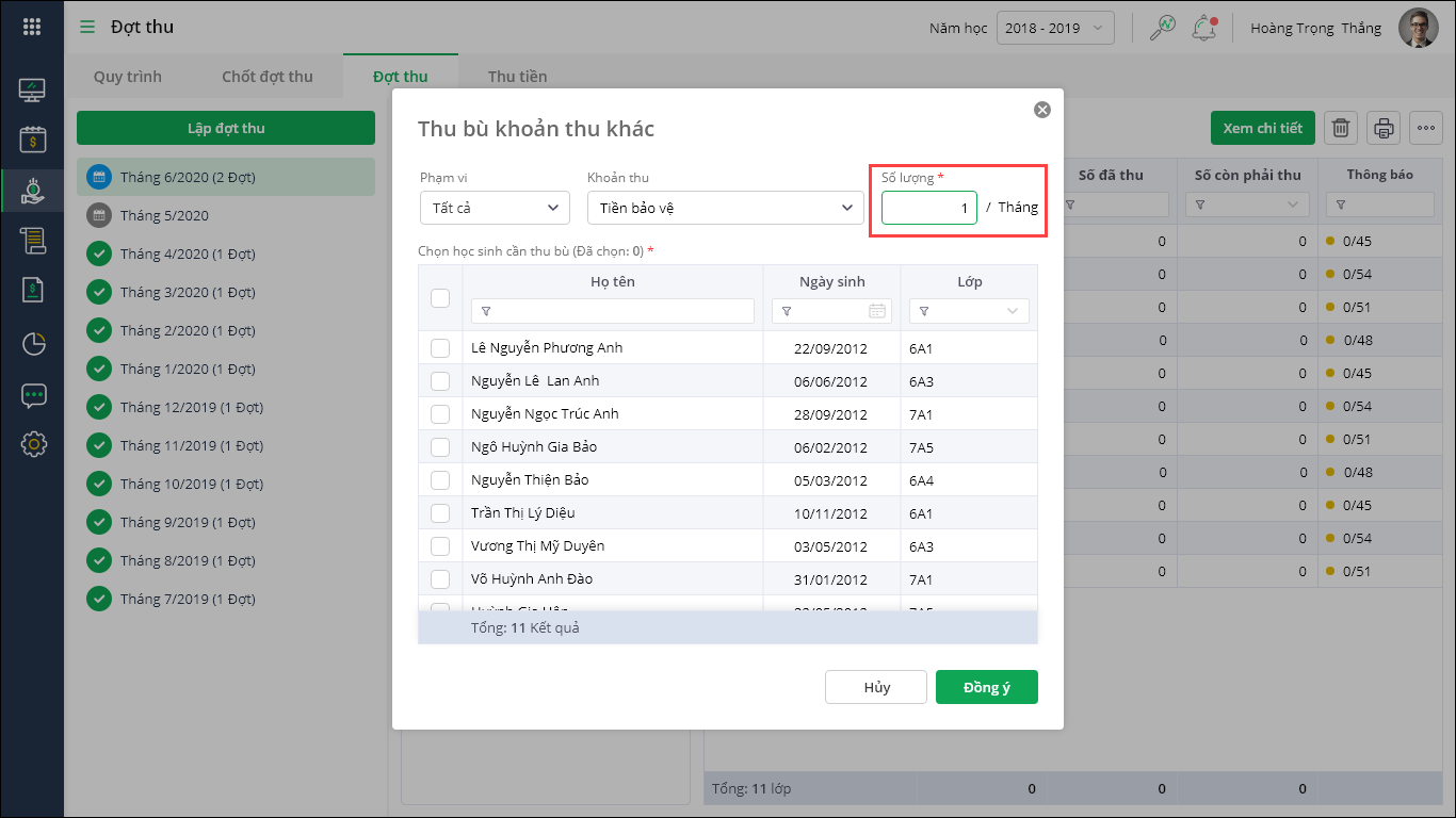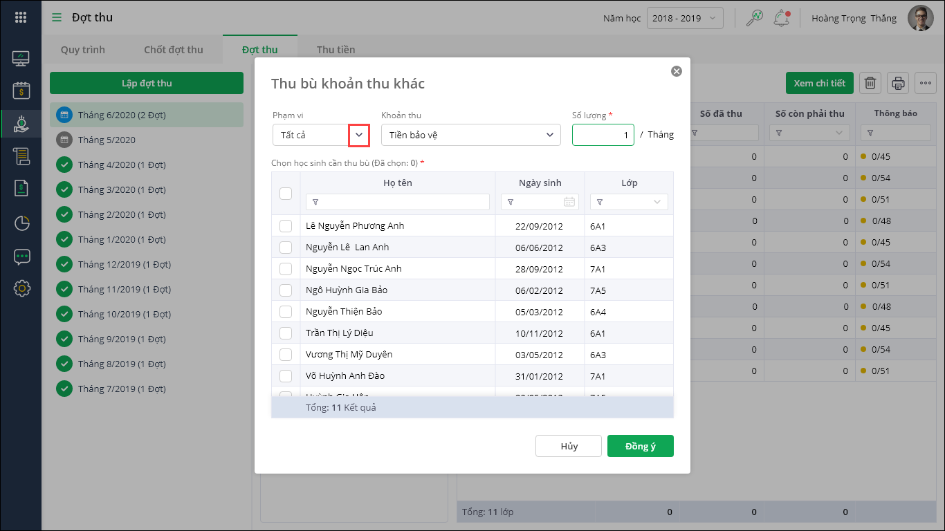 - Tích chọn học sinh cần thu bù, nhấn Đồng ý