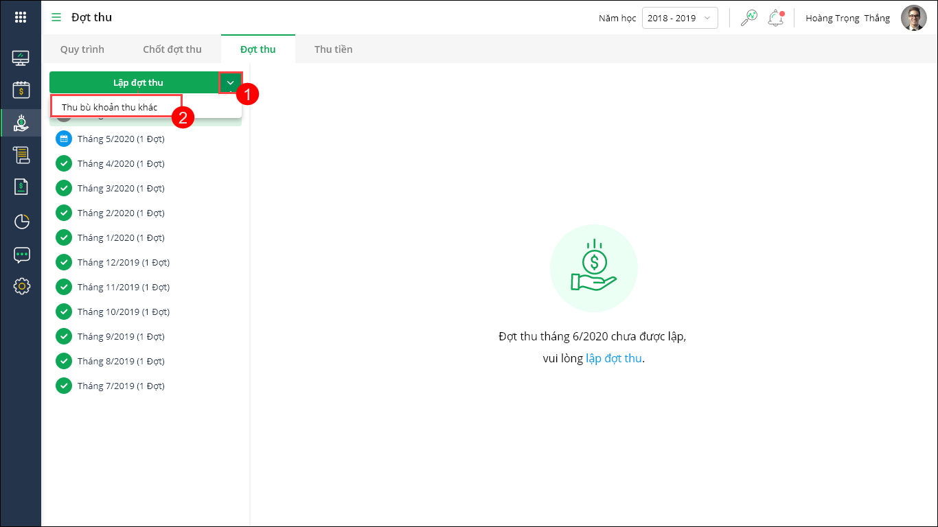 - Vào Quản lý thu\Lập đợt thu, nhấn vào biểu tượng mũi tên tại chức năng lập đợt thu, chọn Thu bù khoản thu khác để lập đợt thu bù khoản thu khác trong tháng đó.
