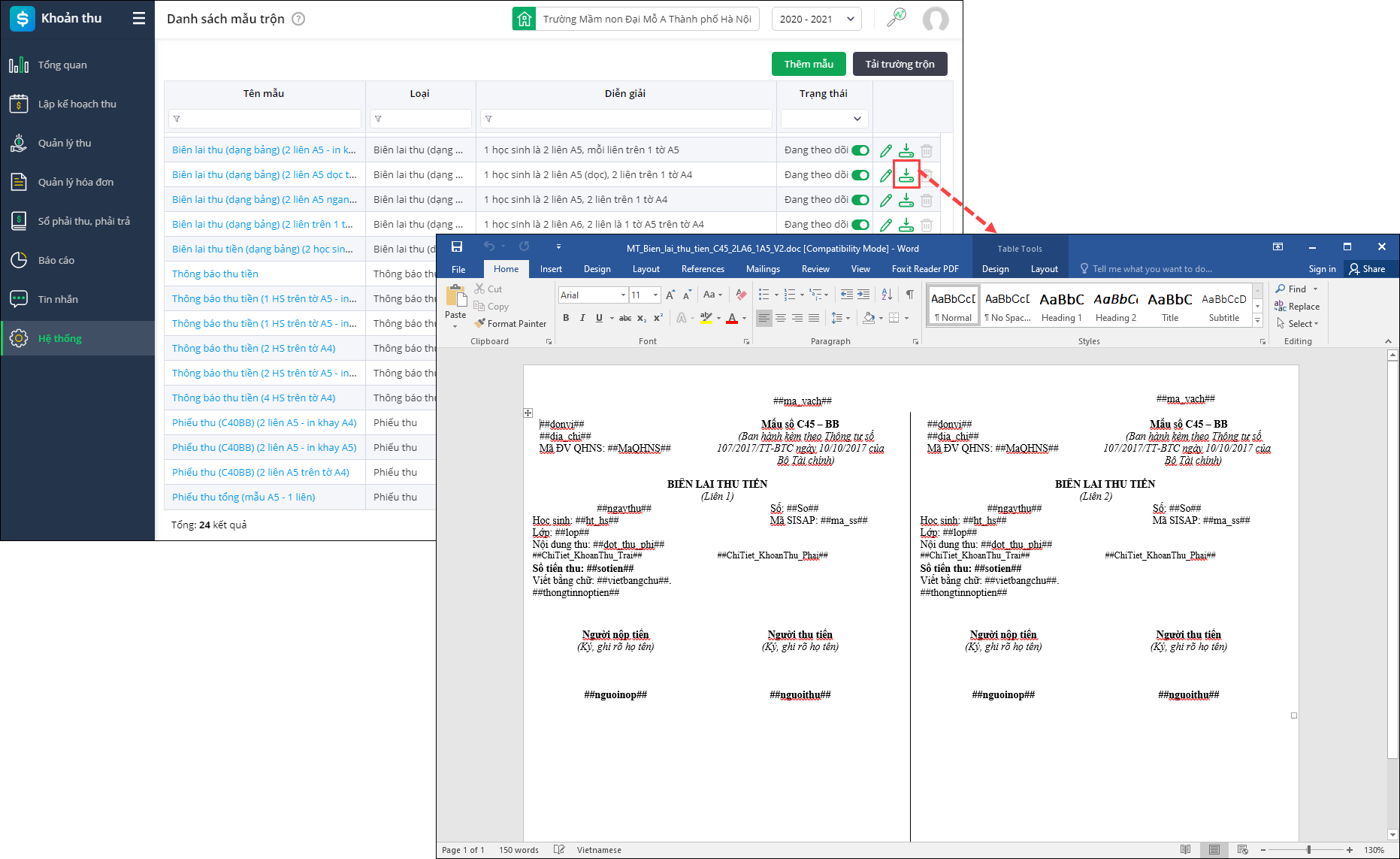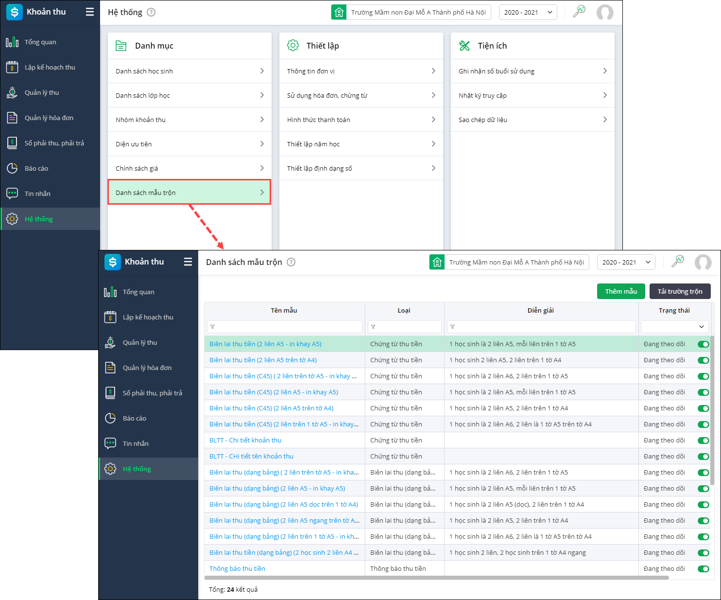 - Vào Khoản thu\Hệ thống\Danh sách mẫu trộn