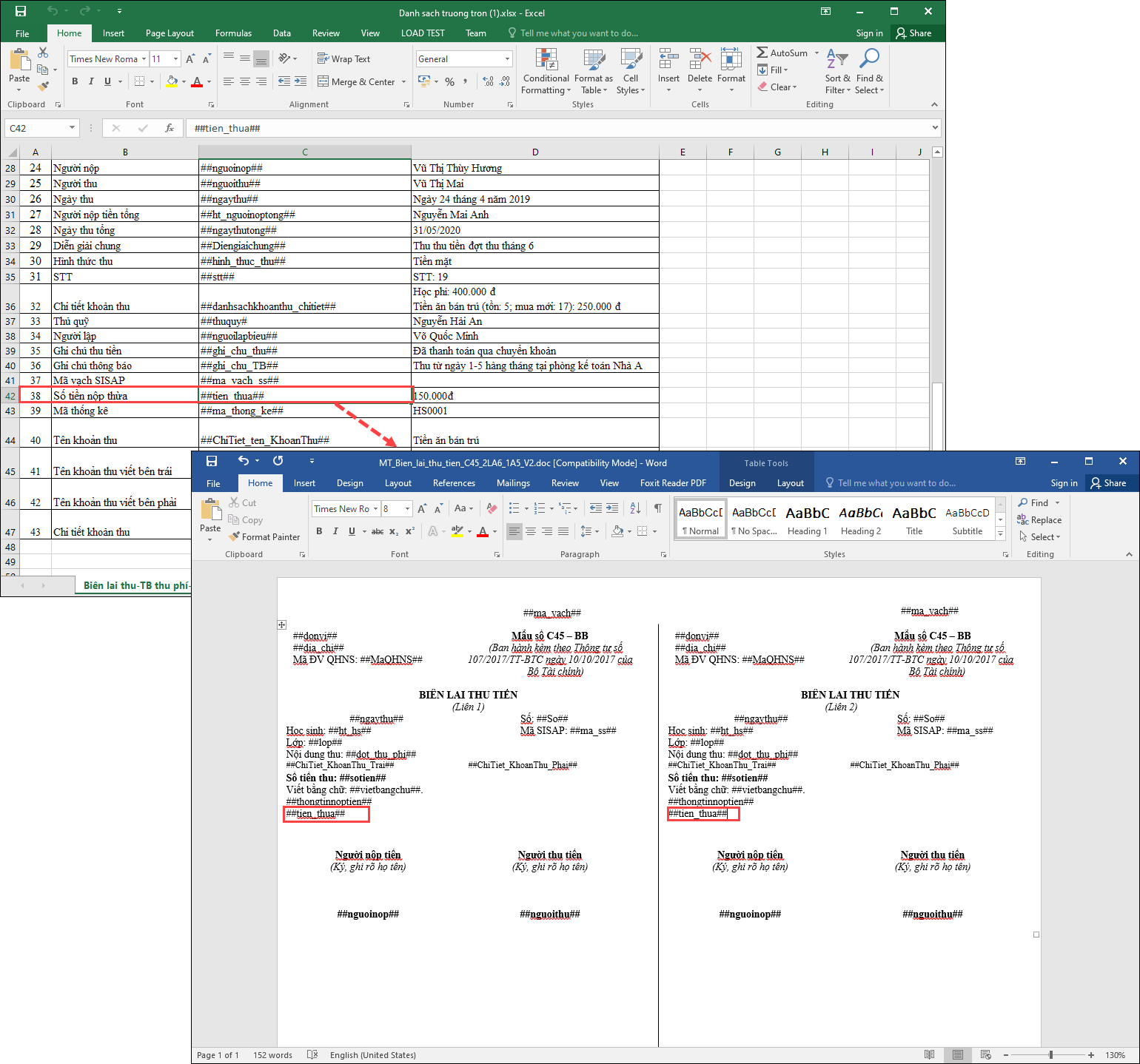Ví dụ: Nếu muốn hiển thị Số tiền nộp thừa để phản ánh số tiền thực thu, tại phần Trường trộn trên Danh sách mẫu trộn vừa tải về anh/chị copy ##tien_thua## sang dòng tương ứng theo nhu cầu trên mẫu trộn vừa tải về.