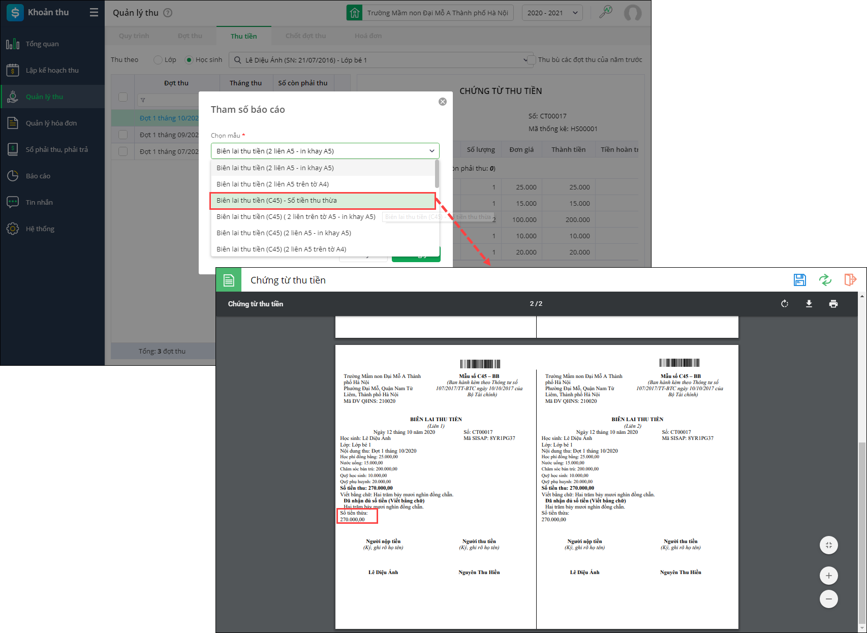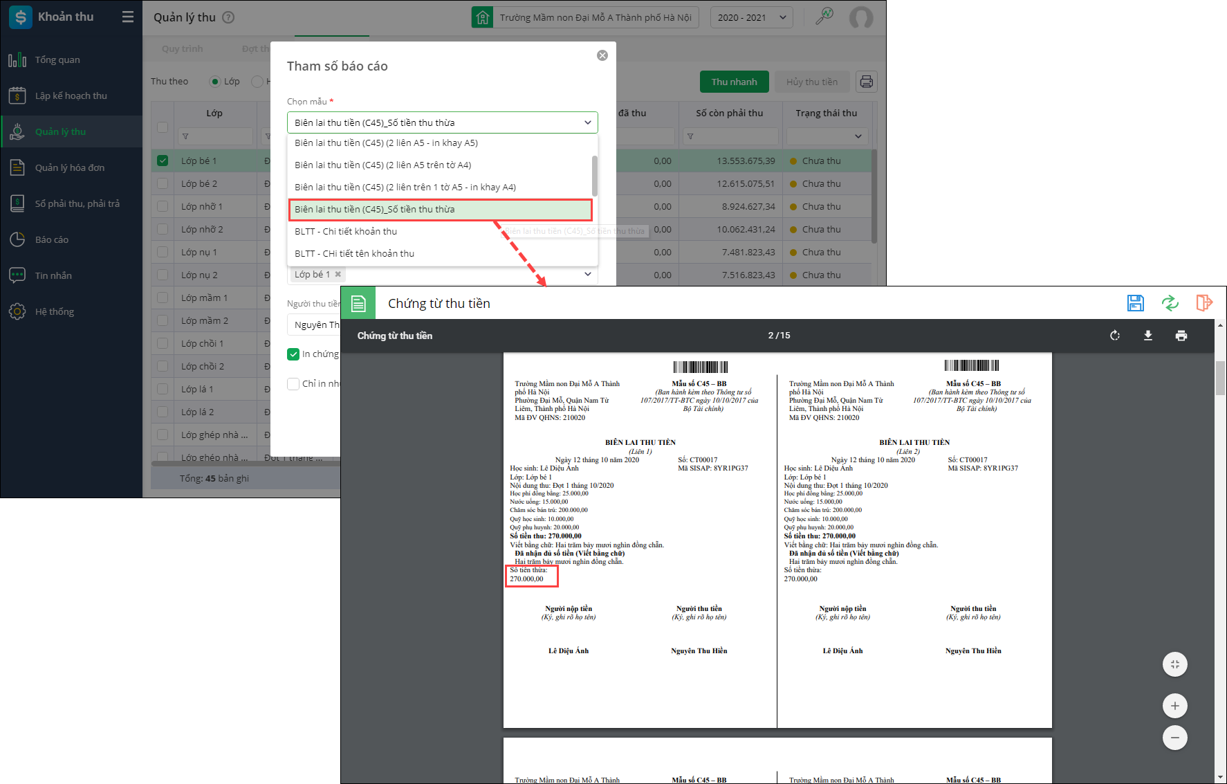- Từ phiên bản R101: Phần mềm cho phép in chứng từ thu tiền trường hợp phụ huynh nộp thừa tiền để phản ánh đúng số tiền thực thu.