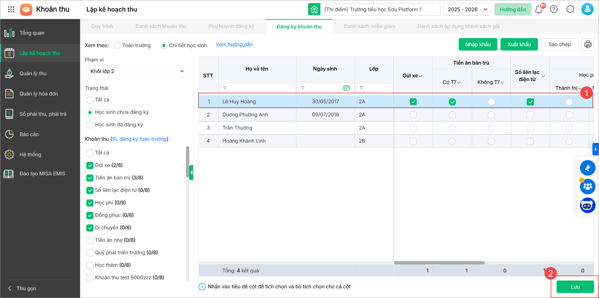 6. Tích chọn học sinh muốn thêm vào đợt thu, nhập tên học và số lượng đăng ký khoản thu tương ứng. Chọn Tiếp tục để bổ sung học sinh vào đợt thu.