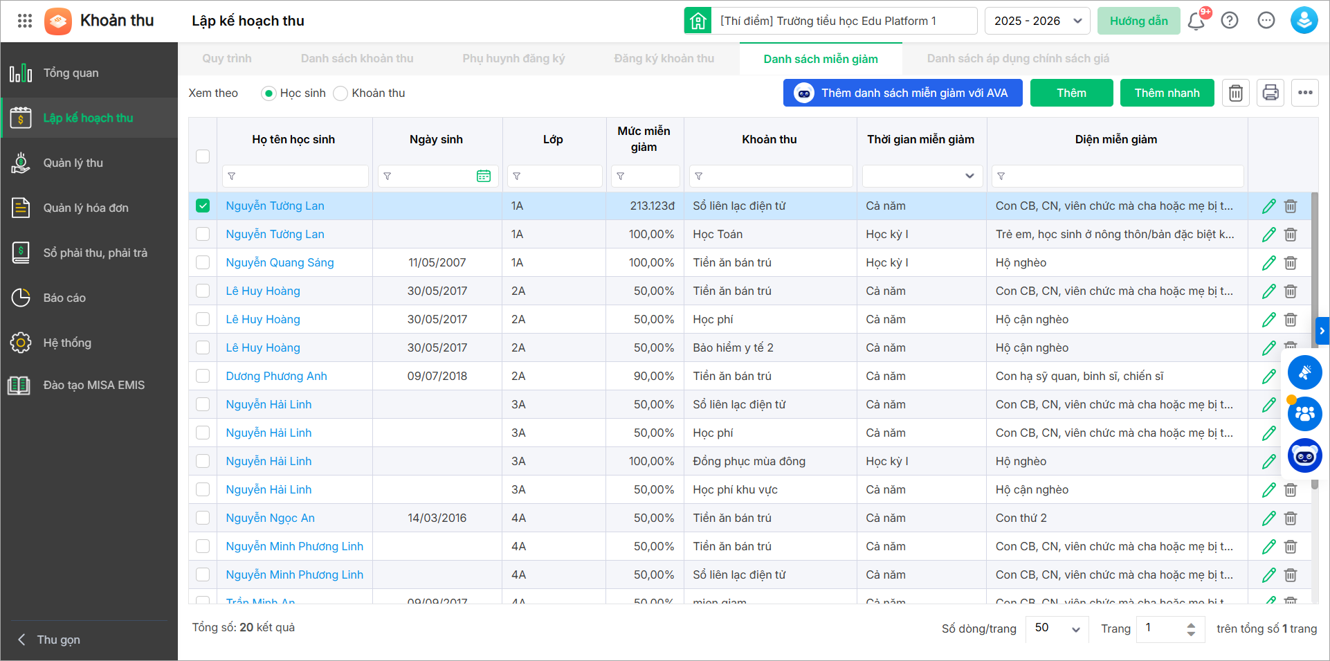 3. Vào Lập kế hoạch thu\ Đăng ký miễn giảm: Khai báo diện miễn giảm nếu có cho học sinh mới đến. (Xem hướng dẫn Đăng ký miễn giảm tại đây)