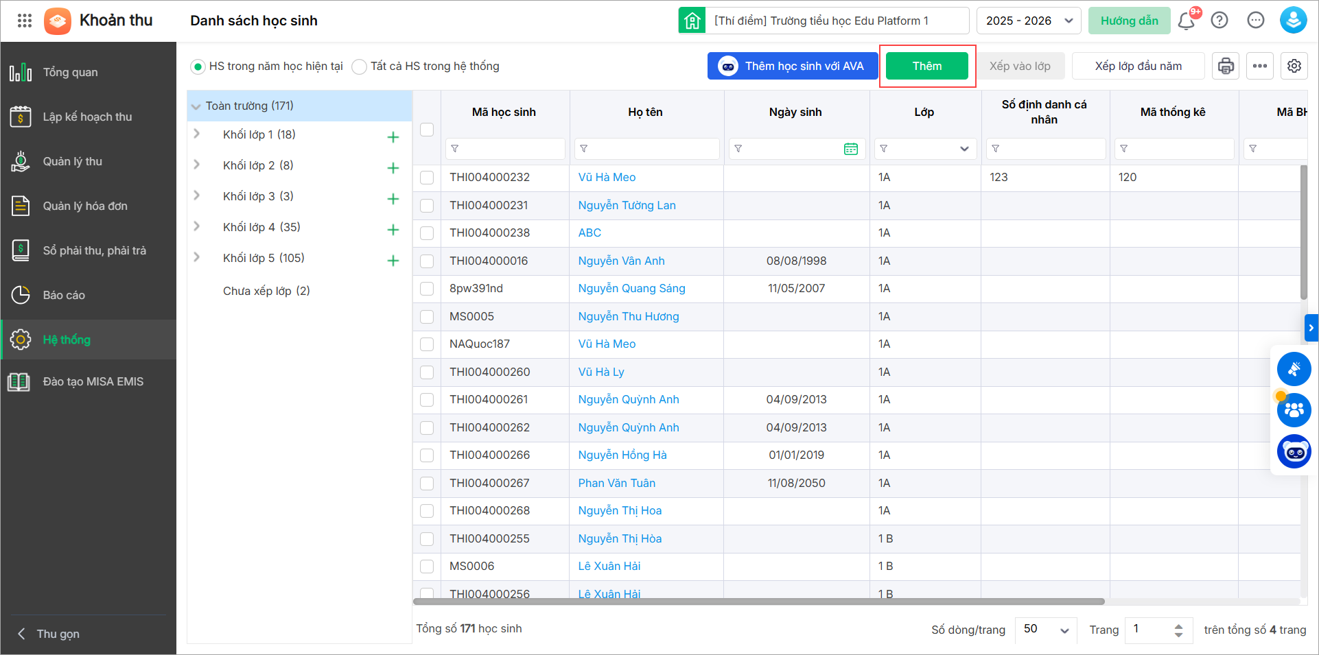 1. Vào Hệ thống\Danh sách học sinh, nhấn Thêm để thực hiện thêm học sinh. (Xem chi tiết cách thêm học sinh tại đây)