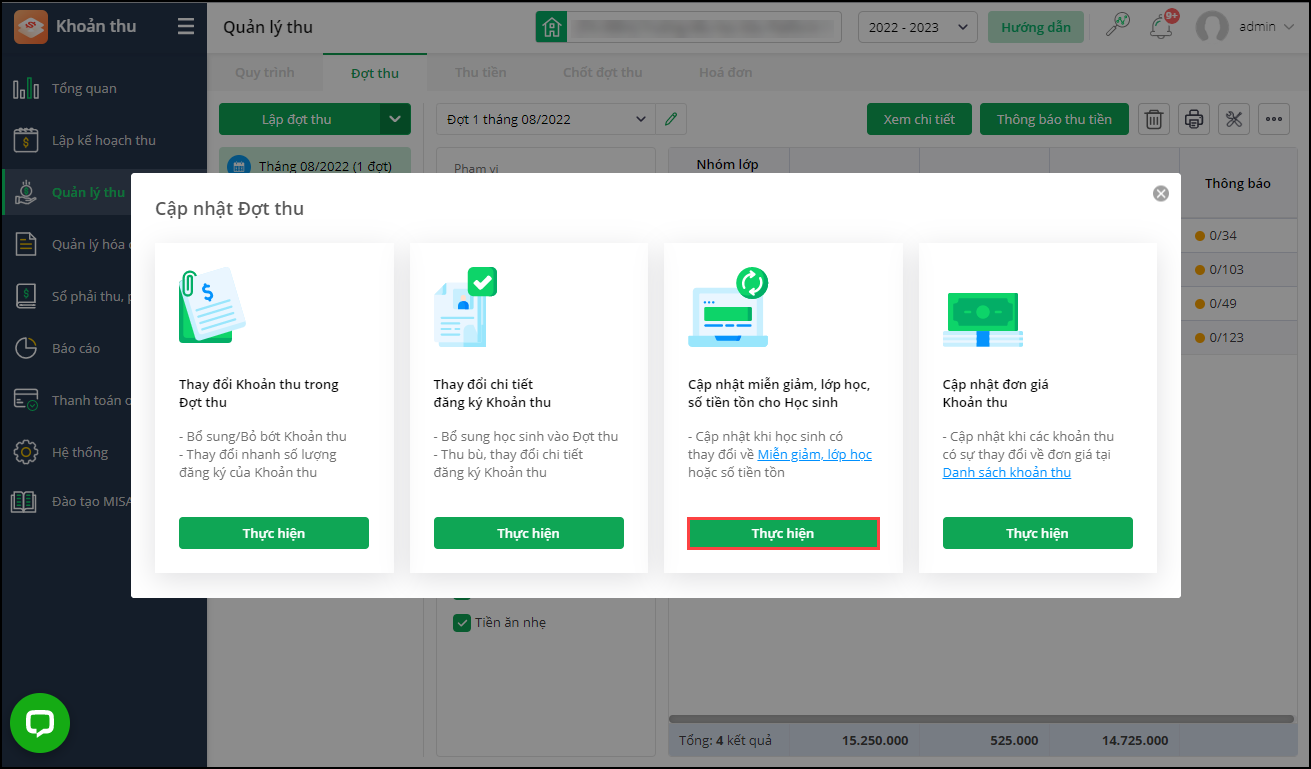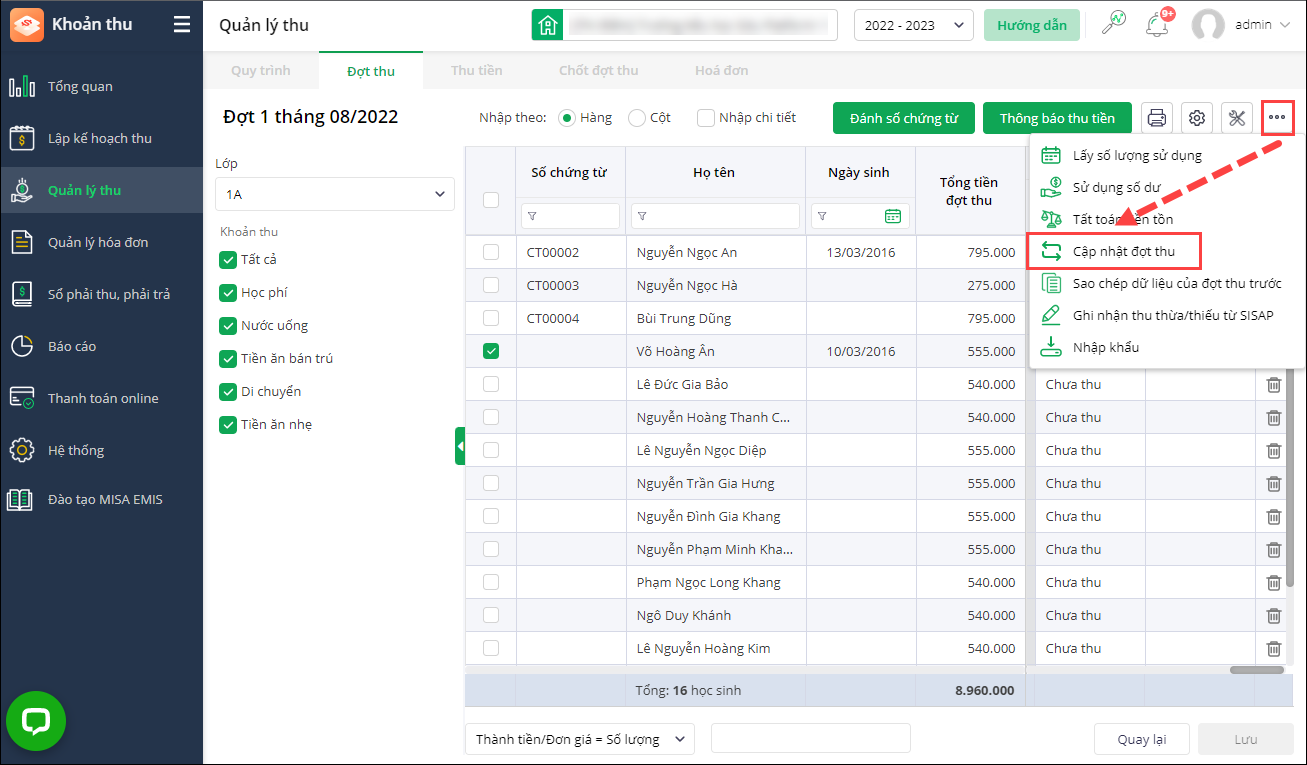 - Phần mềm tự động điều hướng sang đợt thu, anh/chị chọn đợt thu và nhấn vào biểu tượng dấu ba chấm, chọn Cập nhật đợt thu.