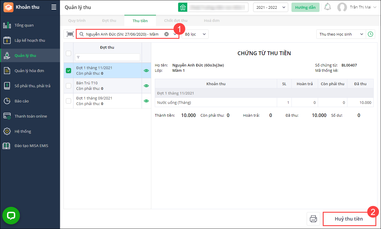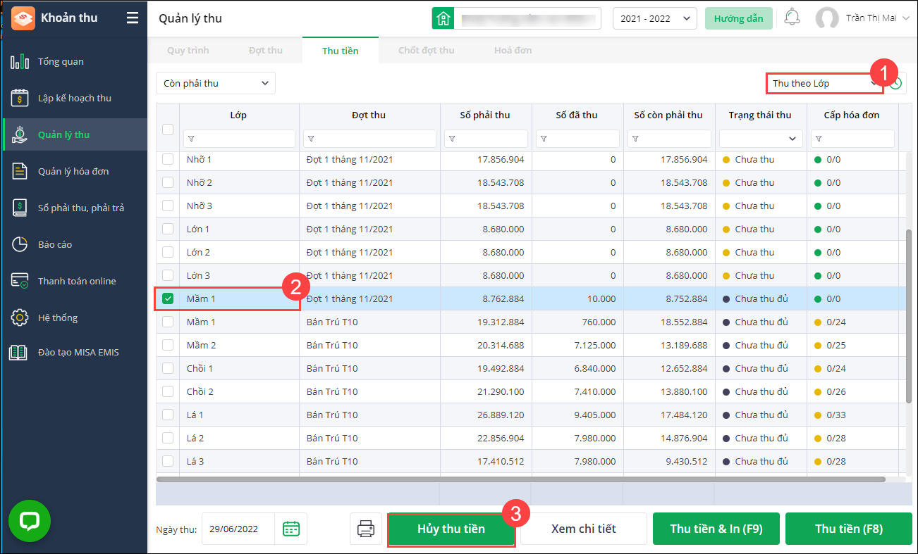 - Nếu chỉ có một vài học sinh không cập nhật đúng, anh/chị vào Quản lý thu\Thu tiền\ Thu theo học sinh: Tìm kiếm học sinh cần sửa, nhấn Hủy thu tiền.