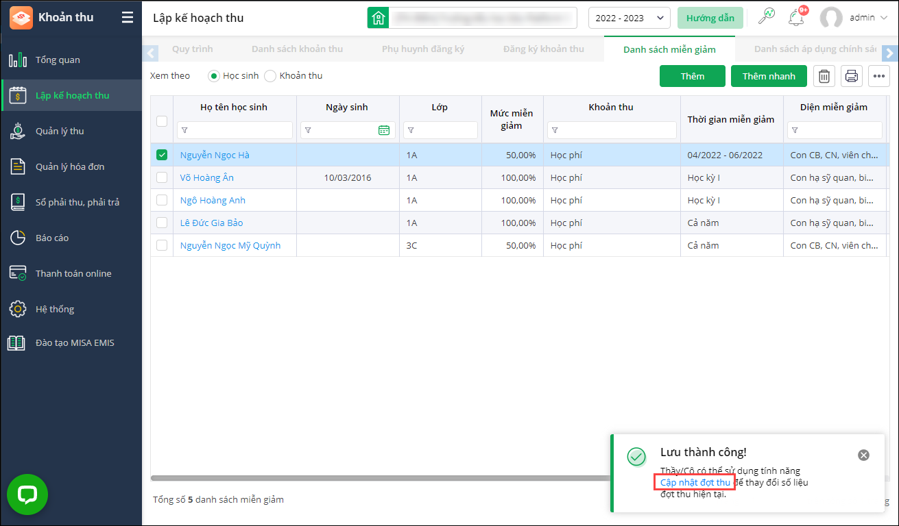 - Sau khi thêm học sinh vào danh sách miễn giảm, phần mềm hiển thị thông báo thành công như ảnh, anh/chị chọn Cập nhật đợt thu.