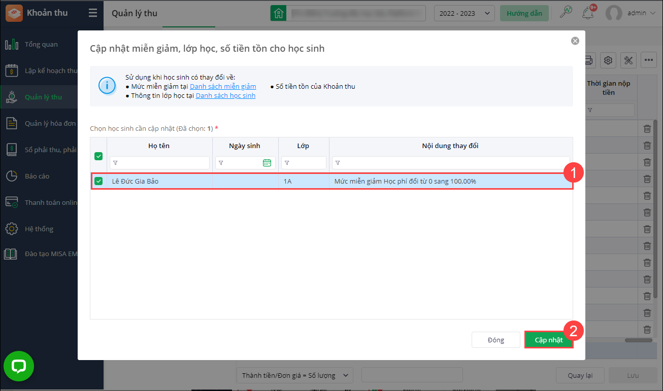 - Nhấn Thực hiện tại Cập nhật miễn giảm, lớp học, số tiền tồn cho Học sinh.