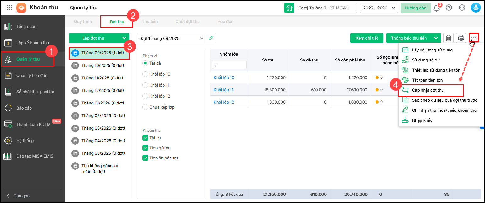 Bước 1: Vào Quản lý thu\Đợt thu. Chọn đợt thu cần bổ sung khoản thu. Nhấn vào biểu tượng dấu ba chấm, chọn Cập nhật đợt thu.