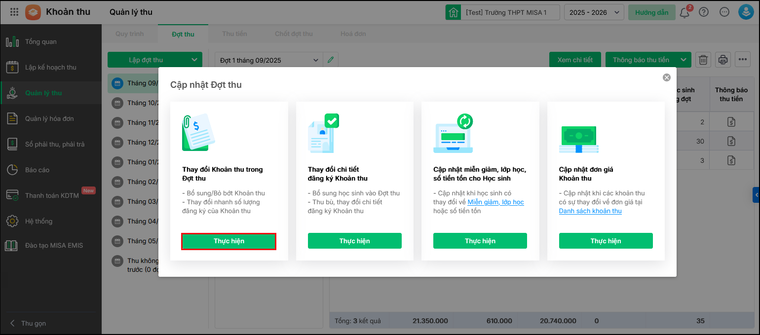 Bước 2: Nhấn Thực hiện tại mục Thay đổi khoản thu trong đợt thu để bỏ bớt khoản thu trong đợt.