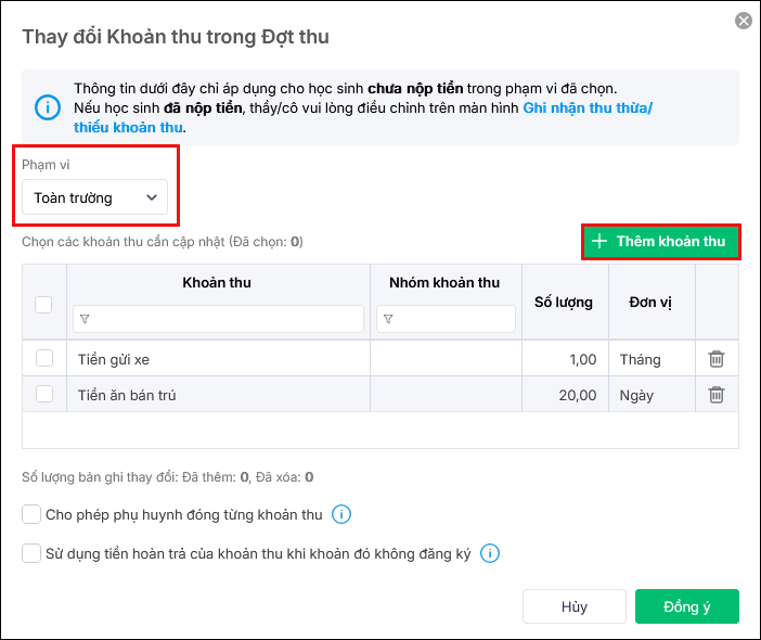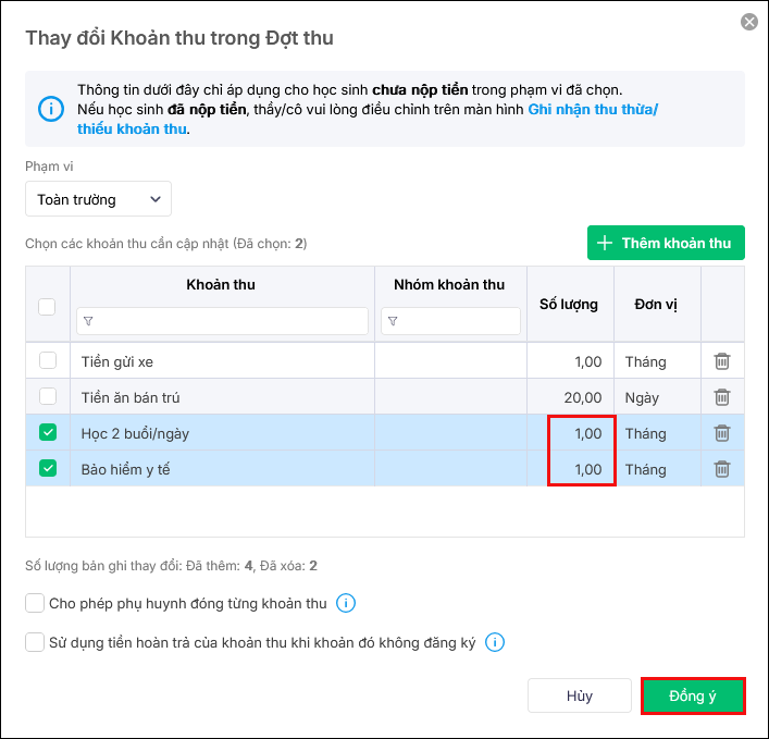 Lưu ý: Trường hợp bỏ bớt khoản thu chỉ cập nhật cho những học sinh chưa thu tiền. Học sinh đã nộp tiền cần Hủy thu tiền sau đó thực hiện lại các bước trên hoặc Ghi nhận thu thừa/ thiếu khoản thu.