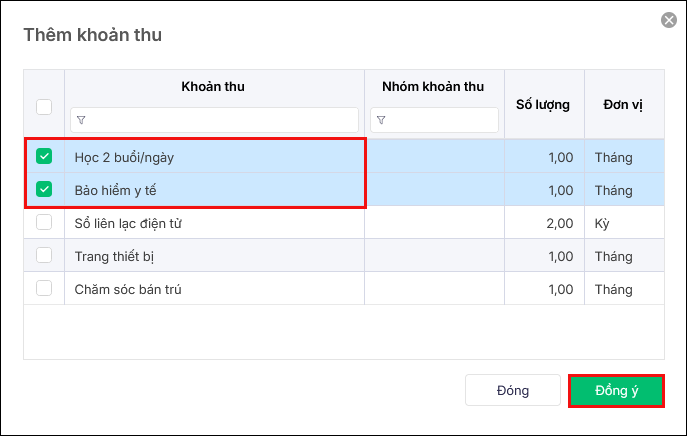 Bước 4: Tích chọn những khoản thu cần thêm vào đợt thu. Nhấn Đồng ý.