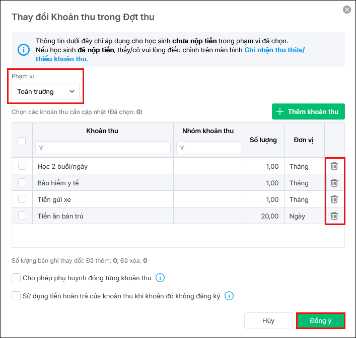 Nhấn vào biểu tượng thùng rác để xóa khoản thu khỏi đợt thu. Nhấn Đồng ý để cập nhật.