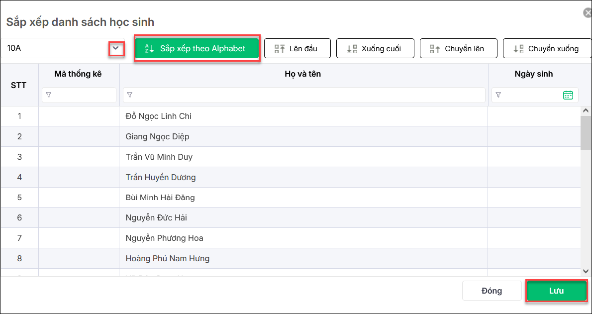 3. Sắp xếp lại thứ tự danh sách học sinh theo Alphabet: Chọn lớp cần Sắp xếp, nhấn Sắp xếp theo Alphabet. Nhấn Lưu