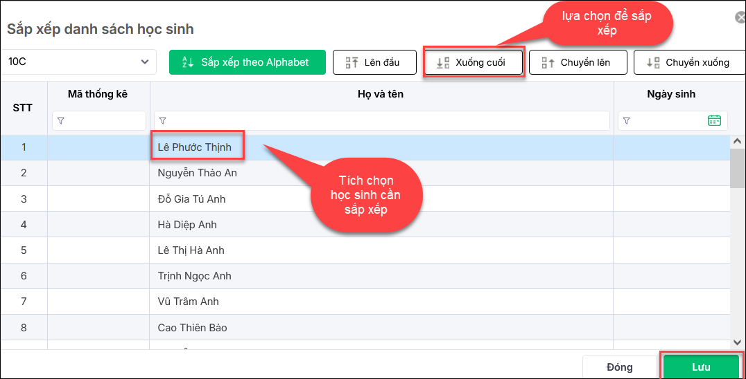 4. Sắp xếp theo nhu cầu khác: Chọn từng học sinh trong lớp, nhấn Lên đầu, Xuống cuối, Chuyển lên, Chuyển xuống để thay đổi vị trí theo mong muốn. Nhấn Lưu