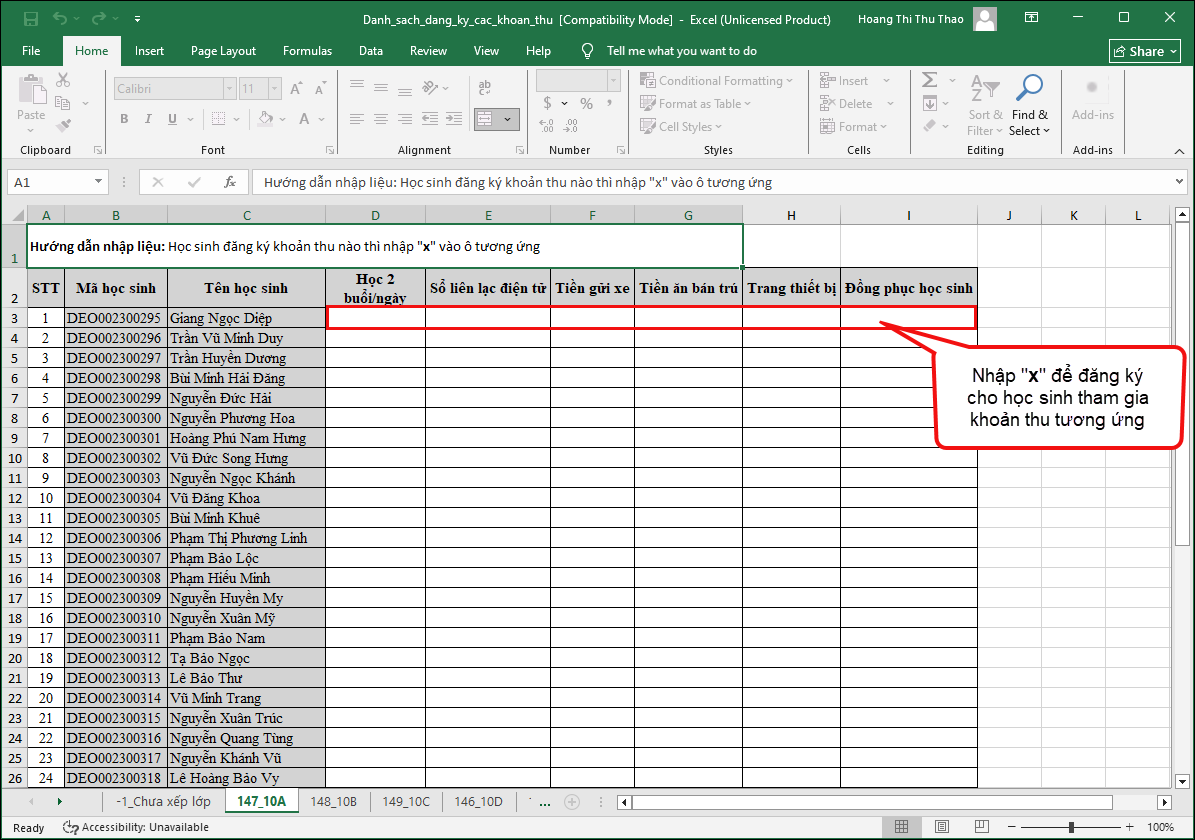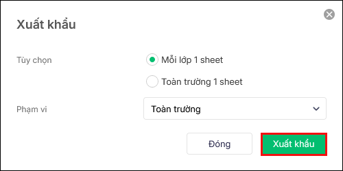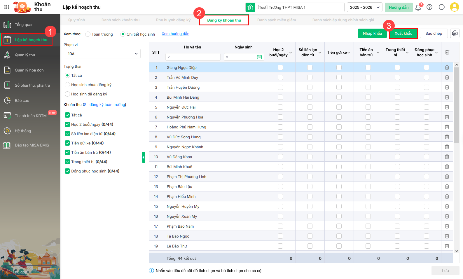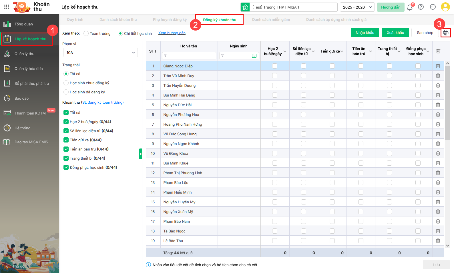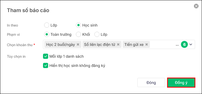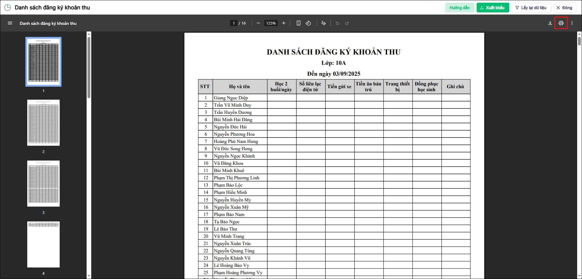 Đối với các khoản thu không bắt buộc, kế toán cần tổng hợp danh sách đăng ký khoản thu của từng lớp. Phần mềm cho phép In danh sách đăng ký khoản thu hoặc xuất khẩu danh sách dưới dạng Excel và gửi về từng lớp cho giáo viên đăng ký khoản thu.